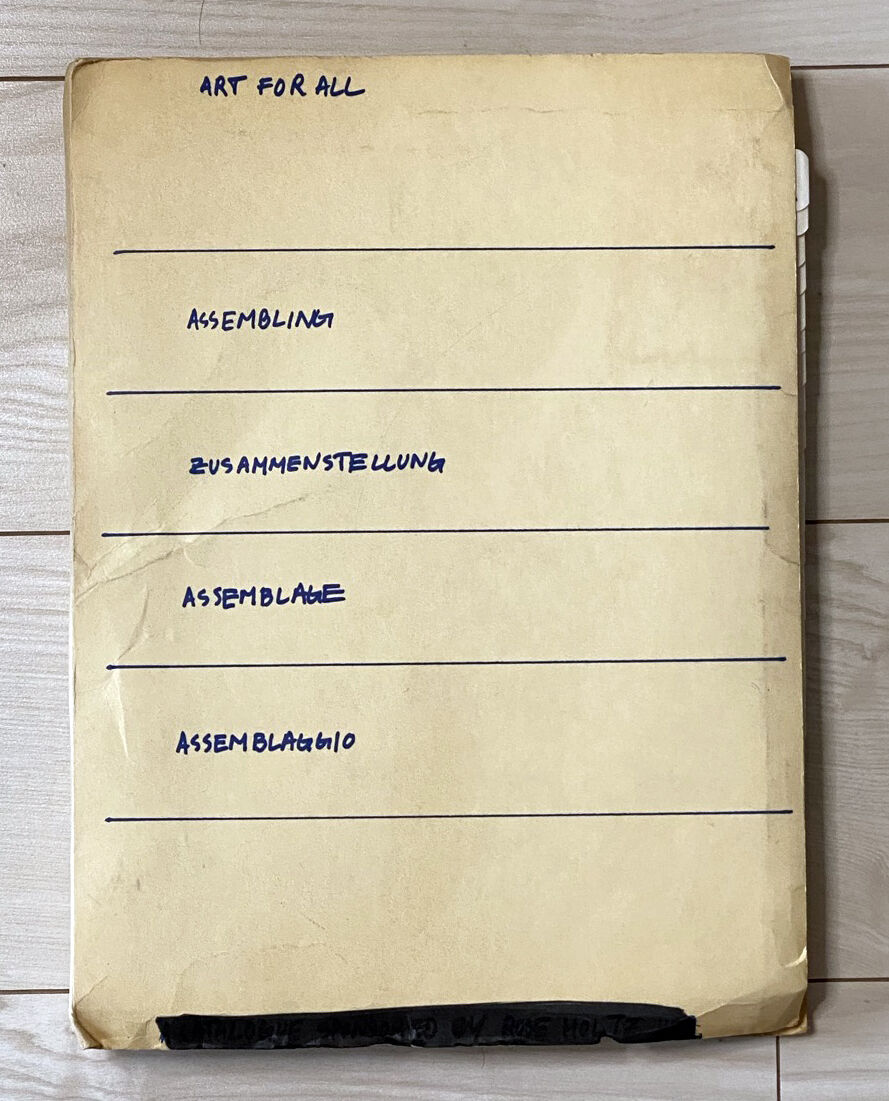 例えば1994年にだされた「ART FOR ALL, ASSEMBLING, ZUSAMMENSTELLUNG, ASSEMBLAGE, ASSEMBLAGGIO, 1994」(ASSEMBLINGは、「集める」の意の英語、続く3つの単語は、同意味のドイツ語、フランス語、イタリア語)というカタログは、両面印刷された紙を、厚紙製のホルダーに納めたものですが、既成のABCインデックスが挿入され、「事務」っぽさを醸し出しています。
