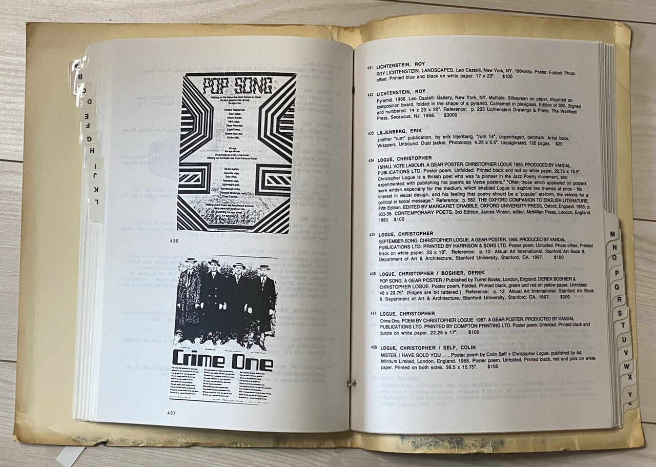 早速、(多分)ファックスで連絡をとりました。すぐに、本やエファメラ、また版画やオリジナル作品を売り買いするようになりました。そして、カタログ送付先のリストにも加えて貰いました。新しいカタログが送られてくると、常にその内容、紹介されている書籍や資料に驚かされ、現代美術の世界、古書の世界、エファメラの世界の奥深さを思い知らされました。