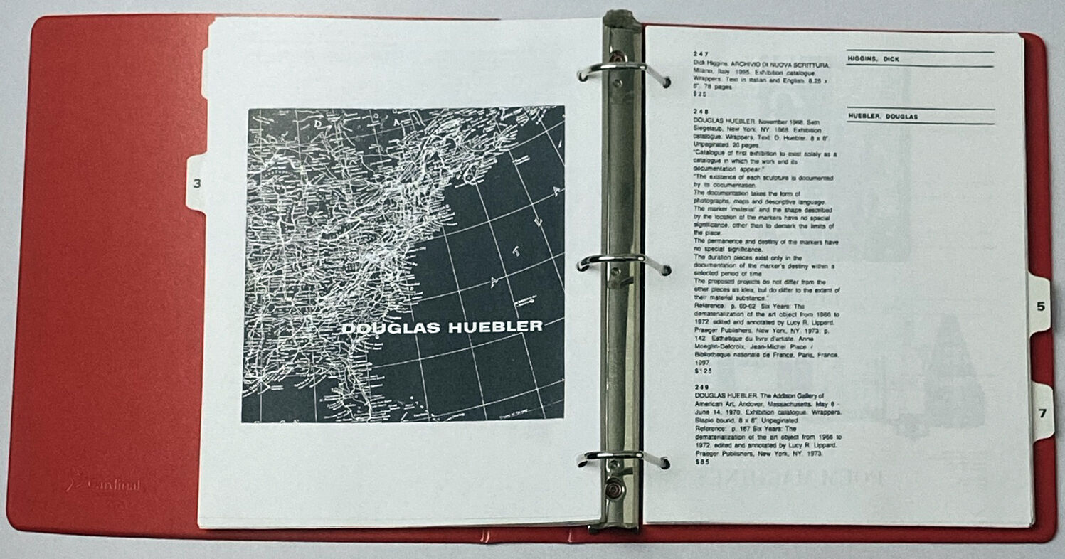 またドイツの通販会社の名前を使い「SCHEISSLADEN」のタイトルが付けられた1998年のカタログも、やはり両面印刷された紙を、今度はビニール製の3穴バインダー入れたものでした。両カタログともに、テーマを絞ったセレクションではなく、展覧会カタログ、案内状、マルチプル、版画、一次資料などが収録、紹介されています。