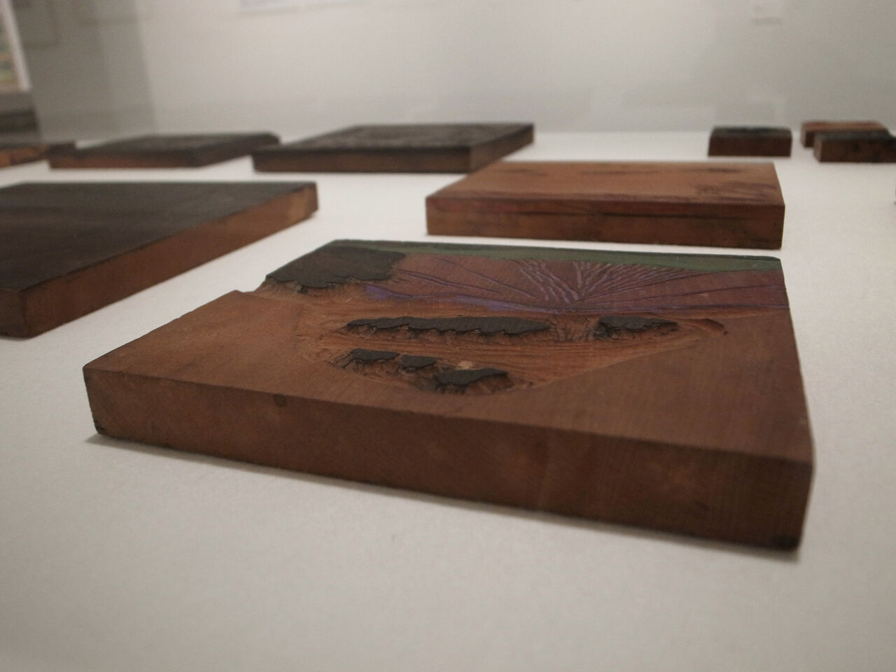 道具前後するが、ケースには版木や彫刻刀なども並び、こちらには筆者も親近感。掌と云うより身体の動きが、道具から伝わる感覚。「日本伝統木版画とはぜんぜん異質の、自由な荒彫りの黒色木版画の制作へと私は乗りだしていった」(109頁)と長谷川。大胆でありながら精緻な画面構成に躍動感が伴うのは、この身体性からもたらされると思うが、浮世絵版画において用紙の裏側からこするバレン刷りの力加減を想像する。画家の場合は「洋風印刷機」を用いた刷りで、「西洋の活版インクの油びかり」を取り除く「いちじるしい労力と時間を食う」(115頁)独自の印刷法の成果であるだろう。展示されている作品個々の技法についての知識を持たない身であっても、落ち着いた作品の精神性を感受する事が出来た。