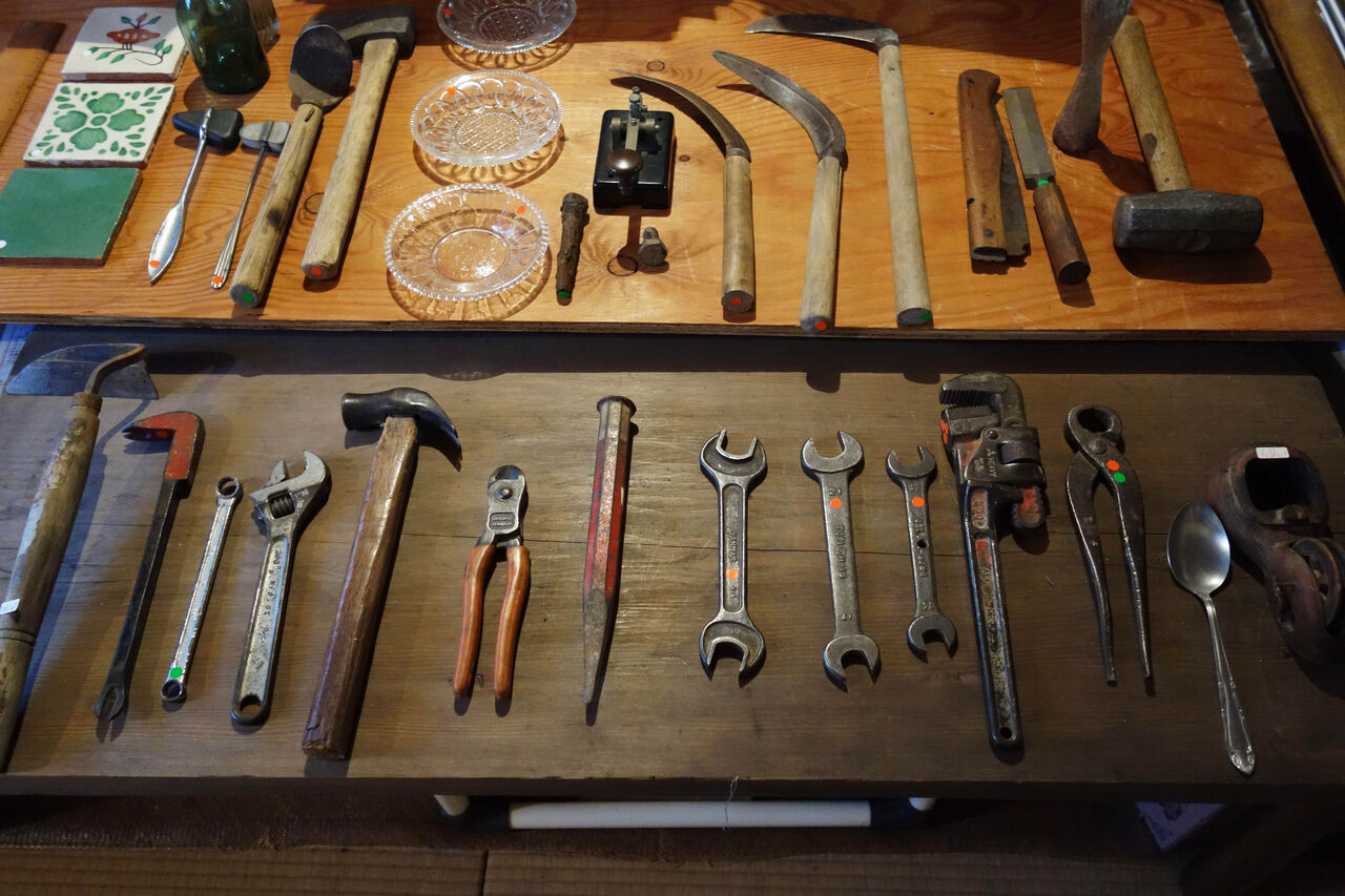 林哲夫『父の道具』展本展開催前の6月初旬、京近美近くの古書店、ブックス・ヘリングで画家・林哲夫による『父の道具』展が催された。農家の長男として育った林が画家をこころざし家を離れて幾星霜、亡父が残した道具に美を見出した。鋤や鍬や鋸、作柄の変化に伴い手を加えた農具と、これを造るための鋸や金槌やペンチの数々。民芸で言う「用の美」と異なる道具そのもの、湿度の国で錆びに覆われ、納屋に長く据え置かれた「物」たち。記憶の世界で、ありふれた鎌やスパナやレンチが、古書店の二階に、納屋と指摘されても可笑しくない空間に置かれていた。画家の眼と云うより、息子の眼が、郷愁を絡めながら埃を払い並べ、展示したかと思う。道具から作業の様子、日常の記憶が蘇る。わたしにも、道具を持った父親の記憶が現れる一時だった。京近美の会場で長谷川潔の工夫を凝らし、手そのものとなった黒ずんだ道具に、心が騒いだのは、林哲夫の並べた道具たちの声でもあったかと思う。こちらは売り物で、手に取り重さを体験できた。
