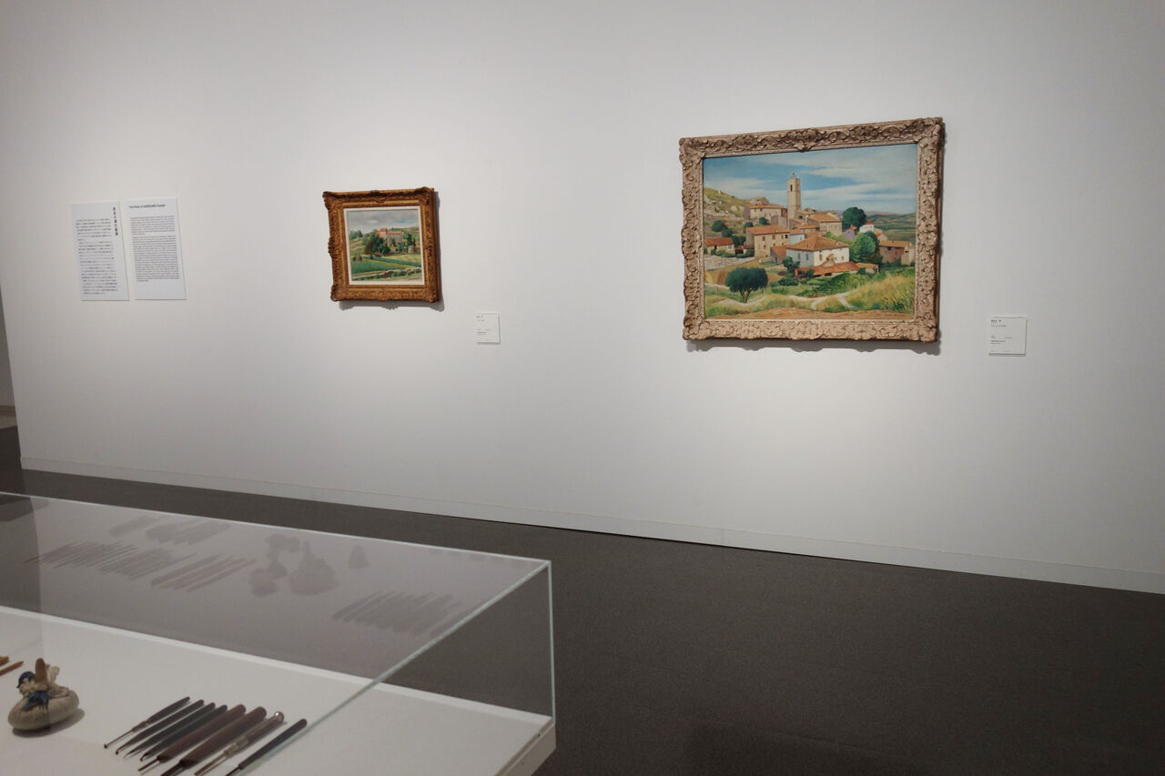 ビュランなど四階奥の壁面に長谷川潔(1891~1980)の版画作品が渡仏前の文学雑誌『仮面』、短歌雑誌『水甕』の表紙画や挿画から、晩年のマニエール・ノワールまでおよそ40点と、油彩5点が掛けられている。京近美がコレクションする243点におよぶ作品や資料から、どれが選ばれ展示されているかは興味ある事柄なのだが、部屋に入って長谷川が用いた道具類に心奪われた。オブジェの様に美しい。ビュランの黒光りした木製の取手と金属の刃先。昆虫の標本ではありませんか。素人なので取手を掌に当て押すのかと思い、作品との関連を見比べながら、時間を忘れた。道具が並べられたケースを回り、菱形や正方形の刃先を覗き込む。長谷川は道具を自作しているし、古い技法を蘇らせたベルソーの場合などでは、芸術的な版画が出来ると確信するも、一旦廃れた道具はパリでも姿を消し「それで、二、三年たちまして、ようやくイギリス製のものを見つけて、それでやり出したのが、1924年だったんです」(『白昼に神を視る』白水社1982年刊。23頁。以下頁数のみの引用表記は同書)と回想する。