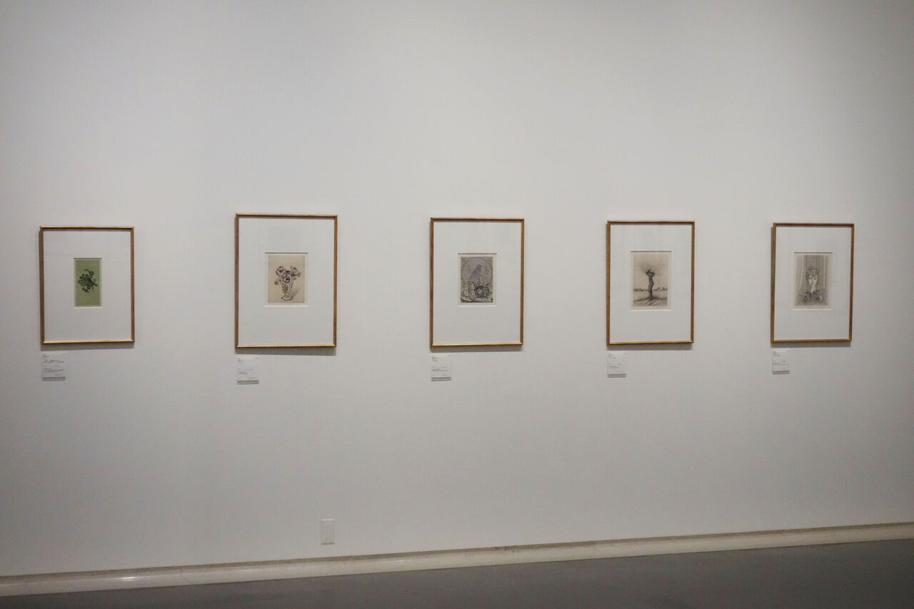 最晩年の長谷川潔が自選した、状態が完璧な版画などによって京近美のコレクションは構成されている。1972年に同館で催された『ヨーロッパの日本作家』展に出品された作品を契機として、毎年15点から30点を購入されたと云う。今回の展示作品に示された表記で、購入年度を確認しながら、画家が残そうとした神祠内部の様子を想像する事になった。それによれば、わたしが好む木版画は最終段階の購入であったらしく、画家が亡くなる半年前に叶ったコレクションによる同館での回顧展以降だった(1979年に受け取るも予算の関係で購入を遅らせたかと思う)。──とすると、人生の明るい時期の記憶にあたるのだろうか。尚、会場には展覧会と作品収集を提案した当時の館長・河北倫明寄贈による油彩『コップに挿した草花』(1932年)も掛けられている。程よい位置取りで慰められた。