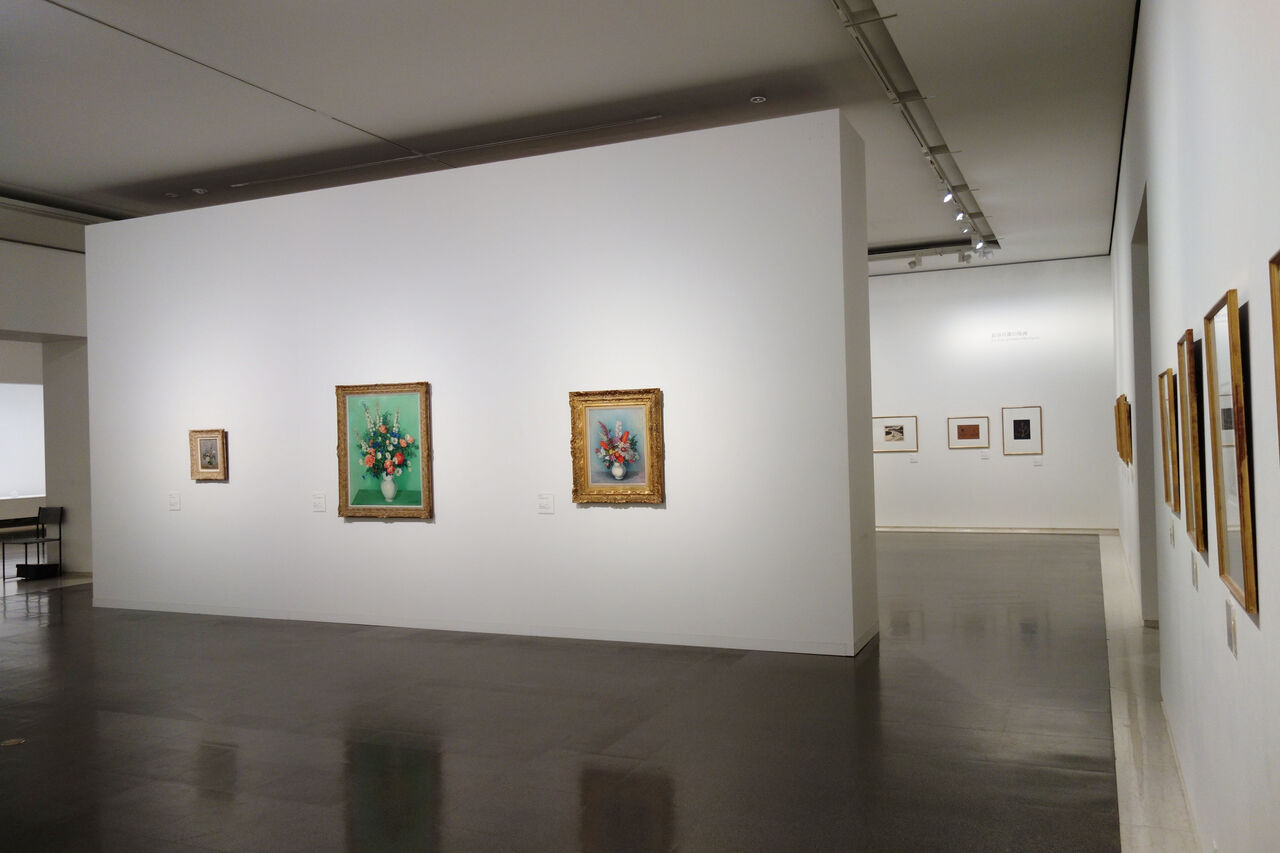 左から『コップに挿した草花』(1932年)、『白い花瓶に挿した薔薇その他』(1938年頃)、『白い花瓶に挿した草花』(1948年)最晩年の長谷川潔が自選した、状態が完璧な版画などによって京近美のコレクションは構成されている。1972年に同館で催された『ヨーロッパの日本作家』展に出品された作品を契機として、毎年15点から30点を購入されたと云う。今回の展示作品に示された表記で、購入年度を確認しながら、画家が残そうとした神祠内部の様子を想像する事になった。それによれば、わたしが好む木版画は最終段階の購入であったらしく、画家が亡くなる半年前に叶ったコレクションによる同館での回顧展以降だった(1979年に受け取るも予算の関係で購入を遅らせたかと思う)。──とすると、人生の明るい時期の記憶にあたるのだろうか。尚、会場には展覧会と作品収集を提案した当時の館長・河北倫明寄贈による油彩『コップに挿した草花』(1932年)も掛けられている。程よい位置取りで慰められた。