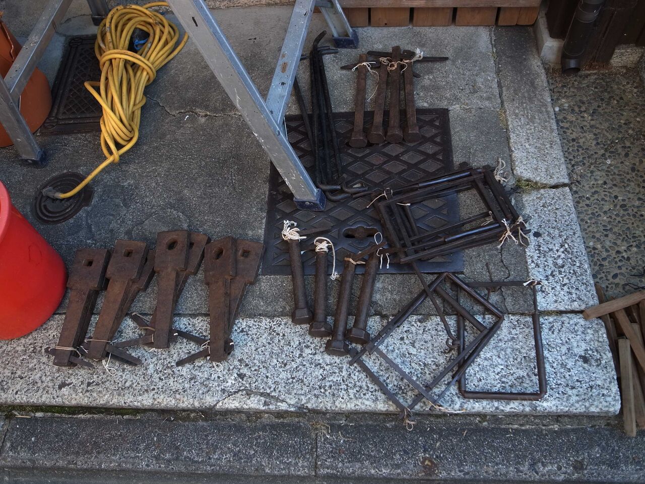 工夫し手に馴染んだ道具が気になりつつ、祇園祭りの鉾町を歩いていると山鉾を「バラシ」ている最中で、路肩を見ると使い込まれた金具の類が置かれている。京都は夏の蒸し暑い盛り、汗まみれの大工方の手際のよさに唸るが、黒ずんだ鉄は良い顔をしている。今年もコロナ禍の蔓延防止対策で巡行は中止となったが、伝統継承の趣旨で鉾建てが行われた。実施出来たのは一部の山鉾、縄がらみで組み立てる際の「掌の加減といった感覚的な調整」は、伝える難しさを伴う。海老などと呼ぶ縄を束ねた形は京都人の美意識に通じるものだが、脇役の鉄の部材もベテランから若手へ伝わり、無骨で美しい。