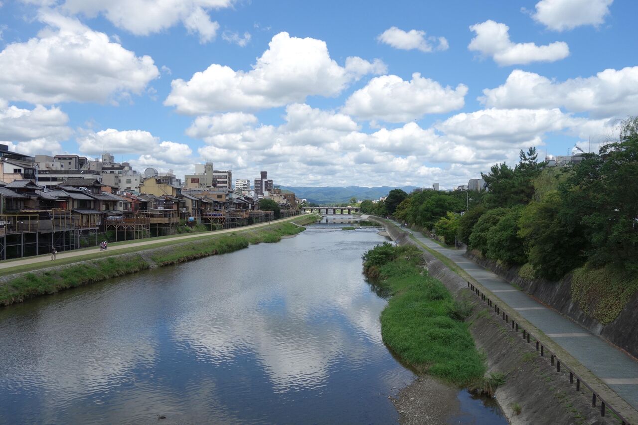 鴨川四条大橋、遠景に三条大橋---