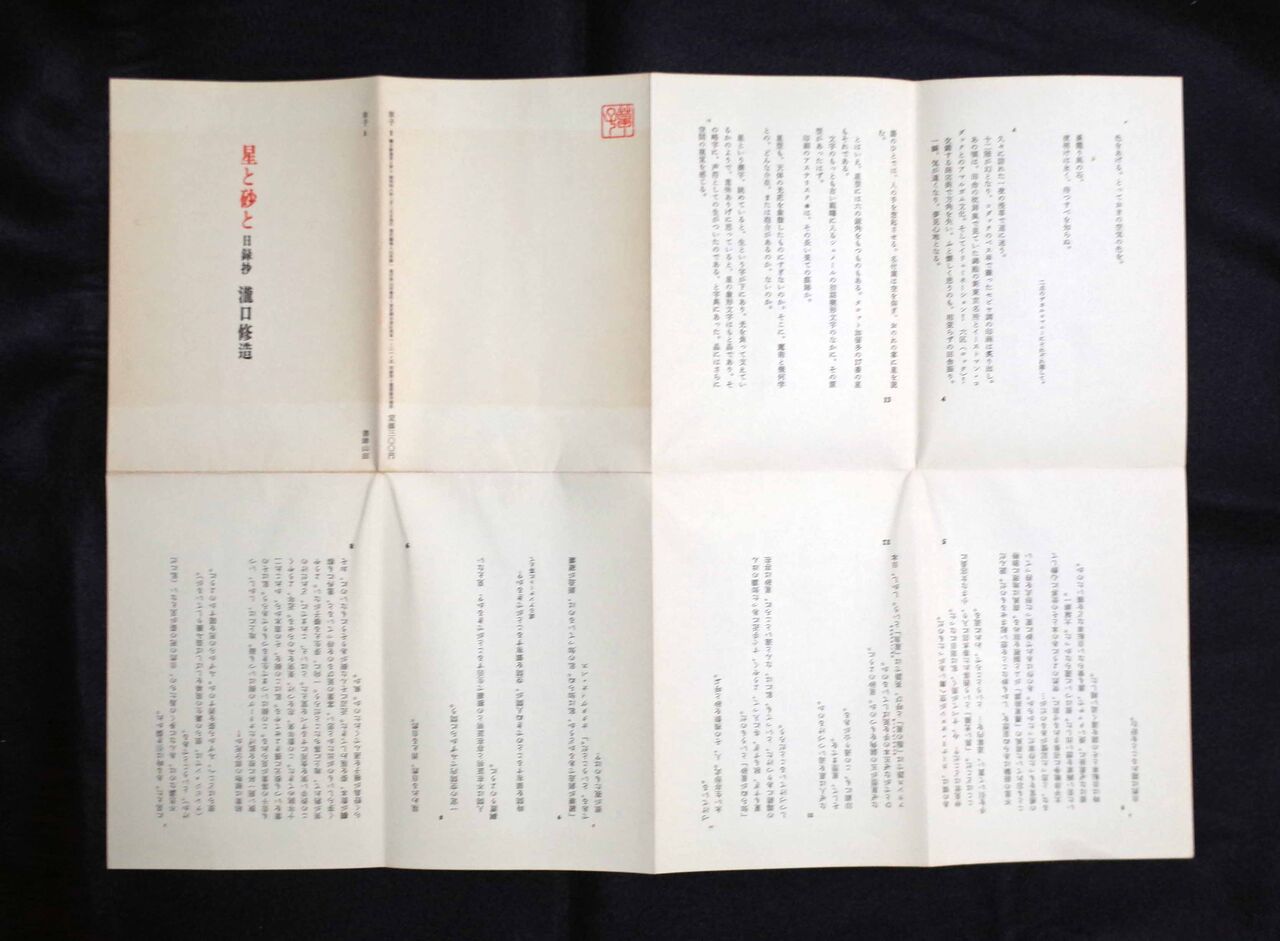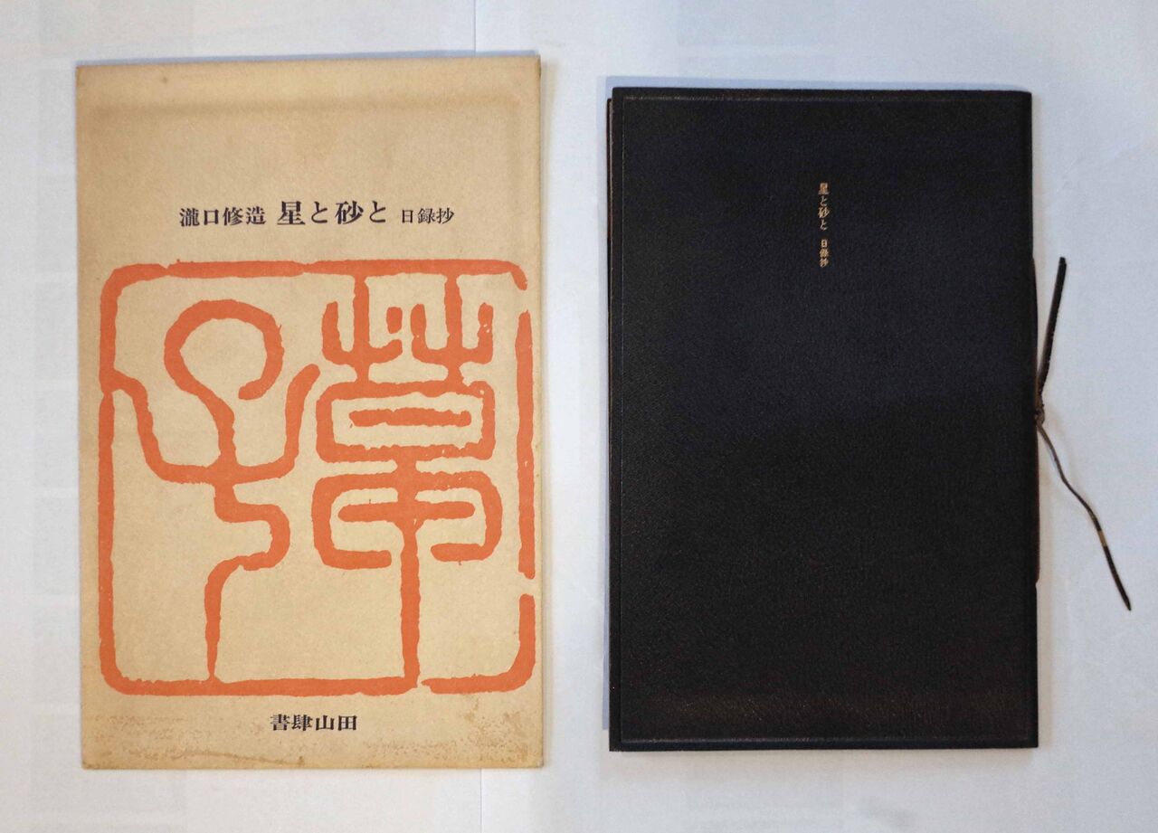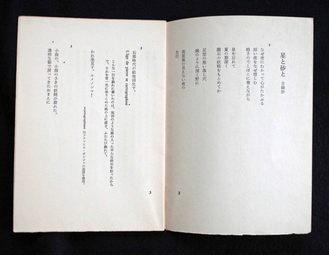 『星と砂と 日録抄』草子1(限定特装版35部署名入り)、書肆山田、1973年6月。変型判(27.8×18.0)15頁、アンカット、袋。和紙(蔵王紙雪晒し)の折り丁ひとつ(16頁)をさらに同じ和紙の表紙・扉・奥付頁の折り丁(4頁)で挟んで本文頁とし、出雲民芸紙雁皮の遊び紙でくるみ、裏にマーブル紙を貼ったインド・ゴート革表紙で挟み込んだ上、同革紐で中綴じしたもの(図3,4)。