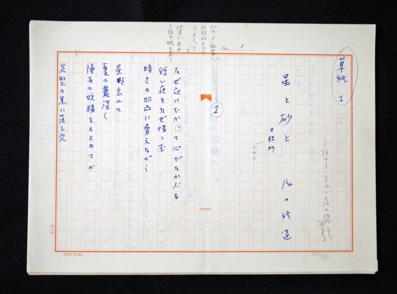 『星と砂と 日録抄』は、書肆山田の「草子」シリーズの「1」として刊行された短篇集です。「日録抄」という副題からすると、日々の記録ないし備忘録である「日録」から、11篇の随想・詩・断章などを選んで収録した本のようですが、11篇の各篇には、『寸秒夢』(第18回)所収の「夢三度」で付されていた日付が見当たりません。その代わり11の(すなわち全体の)末尾に、「夏から冬へ。1972」という記載が置かれています。本書とは別に、瀧口には「日録」と題された1篇があります(日本読書新聞1969年3月17日号に掲載。「本の手帖」特集瀧口修造、1969年8月に再録。図5)。こちらは「1月某日」で始まる記述6節、「2月某日」で始まる記述1節の、計7節から成り、本書よりも「日録」に相応しい形です。ということからすると、本書は1972年夏から冬にかけての「日録」に加除修正が行われ、編集されたものかもしれません。浄書稿が残されています(図6)。