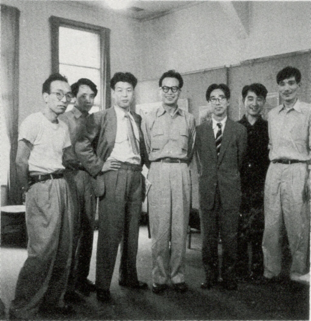 泉茂作品展スナップ(左から瑛九、加藤正、久保貞次郎、早川良雄、山城隆一、福島辰夫、泉茂)