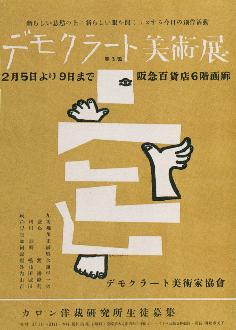 デモクラート美術家協会は1951年(昭和26)に大阪で結成されました。当時、日本で活動していた多くの作家たちは、アンデパンダン展もしくは審査制度の公募展を通して作品を発表していました。このように公募美術団体が美術界において大きな影響力を持っていた当時、独自に制作、発表を行うグループが数多く結成される中、特に反公募を大きく掲げたグループがデモクラートです。