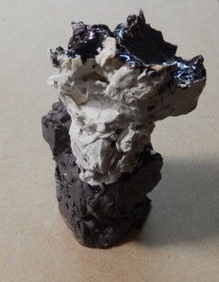 ただ、問題なのは、焼成時までの乾燥に二週間余はかかることと、電気炉での焼成だ。同量の紙片が混じった泥漿は固形化する。焼成に時間を掛け、300℃まで12時間、800℃までに9時間、この間に作品の表面と内部温度がほぼ同一になり、塊が破裂したりしない。時間をかけないと表面と塊りの中心の温度差から破損してしまう。では泥漿に混ざった紙片はどうなるのか? 当然高熱で燃えて煙りが火になって炉中で爆発するのではと心配するが、そうはならない。多分、酸化燃焼によるものと思われる。どうにか完成させ個展初日を迎えた。