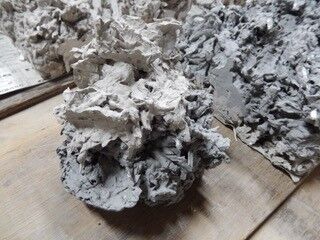 作品の乾燥状態ところで、この制作課程が大変。一旦柔らかな陶土塊を薄くスライスして乾燥させ、砕いてから水を加える。次に同量の記録紙片と泥漿を混ぜ合わせる。一度に大量を撹拌できないから、手頃な器を使い、竹べらで乾燥した紙片とどろどろした泥漿を根気良く無心になって攪拌する。小さなつむじかぜが踊るようだ。そして紙片混合泥漿の粘度を調節し、深みのあるティッシュペーパーの箱やボール箱に流し込む。まるで菓子作り職人モドキだが、これがまた意外に楽しい。