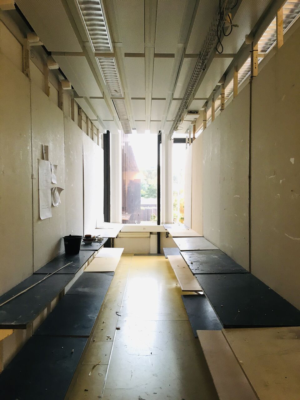 アトリエの様子を見ていきましょう。それぞれのアトリエには人数分の机があります。学生たちは他の授業の合間を見つけてはここで設計課題を進めていきます。