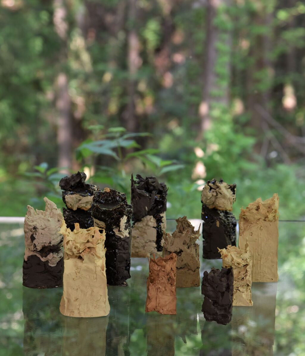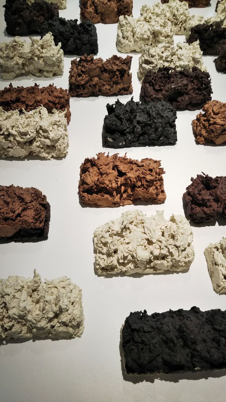 《回帰記憶》と題された新作は、一見したところチョコレート菓子のような、滑らかで柔らかそうな立体である。材質はやはり陶だが、スイーツのような外見からパリパリあるいはサクサクとした食感のあと口内にゆっくり溶け広がるような硬さと柔らかさ、また色の違いにホワイトチョコ、ミルクチョコ、ビターチョコといった味の違いを想像してしまうのではないだろうか。