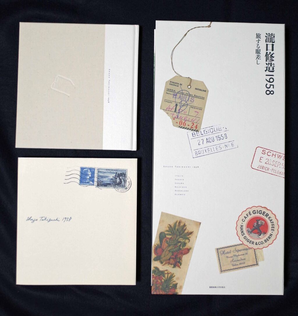 1) 1958年の欧州旅行:5月25日羽田発、10月12日帰国。ヴェネチア・ビエンナーレのコミッショナーを務める。フォンタナ、ムナーリ、ダリ、デュシャン、ミショー、ブルトンらと面会。旅程などの概要は、慶應義塾大学日吉キャンパス来往舎ギャラリーでの「瀧口修造1958―旅する眼差し」展図録(慶應義塾大学アート・センター、2005年12月。図14)に、また旅行中に撮影された写真や綾子夫人に出された絵ハガキ(複製)などによる旅の全貌は、函入り豪華本『瀧口修造 1958 旅するまなざし』(慶應義塾大学出版会、2009年1月。図15)にまとめられています。