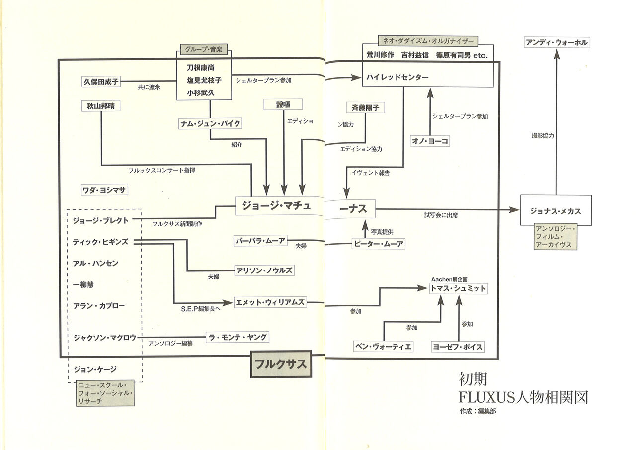 フルクサス関連作家:秋山邦晴、ディートリヒ・アルブレヒト、エリック・アンダーセン、靉嘔 ヨーゼフ・ボイス、ジョージ・ブレクト、ジョン・ケージ、ヘニング・クリスチャンセン、フィリップ・コーナー、マース・カニングハム、ウィレム・デ・リダー、フランソワ・デュフレーヌ、ロベール・フィリウー、アルバート・ファイン、イアン・ハミルトン・フィンレイ、ヘンリー・フリント、ケン・フリードマン、アル・ハンセン、ビチ・ヘンドリックス、ジェフリー・ヘンドリックス、ディック・ビギンズ、ハイレッド・センター、アリス・ハッチンス、一柳慧、和泉達、レイ・ジョンソン、ジョー・ジョーンズ、アラン・カプロー、ペア・カーカビィ、ベングト・オヴ・クリントベルグ、ミラン・クニザク、アリソン・ノウルズ、アーサー・クプケ、小杉武久、久保田成子、フレドリック・リーバーマン、ジェルジ・リゲティ、ジョージ・マチューナス、ジャクソン・マクロウ、ジョナス・メカス、ラリー・ミラー、ピーター・ムーア、シャーロット・モーマン、クレス・オルデンバーグ、オノ・ヨーコ、ロビン・ペイジ、ナム=ジュン・パイク、ベン・パターソン、ジェイムズ・リドル、テリー・ライリー、ディーター・ロート、ジェローム・ローゼンバーグ、斉藤陽子、トマス・シュミット、サラ・シーガル、ポール・シャリッツ、塩見允枝子、ダニエル・スポエリ、刀根康尚、ローラン・トポール、ベン・ヴォーテイエ、ヴォルフ・フォステル、ワダ・ヨシマサ、ロバート・ワッツ、エメット・ウィリアムス、ラ・モンテ・ヤング