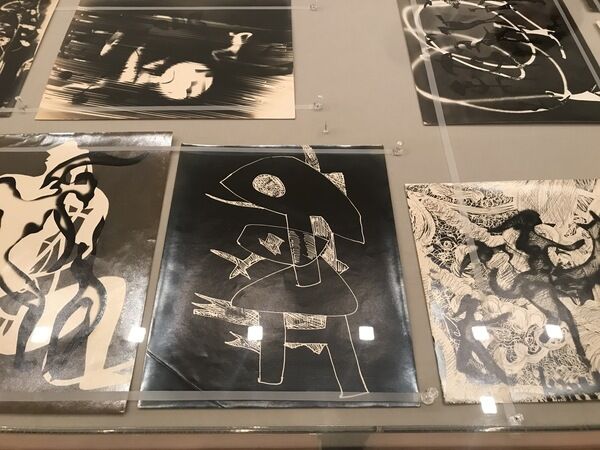 油彩、フォト・デッサン、コラージュ、ドローイング、版画と、技法は多岐にわたり、瑛九の挑戦を一望することができます。特にフォト・デッサンは自由に楽しんで制作しているのが伝わるチャーミングな作品ばかりでした。弊社にあるフォト・デッサン型紙(セロファン)で制作されたフォト・デッサンが2種類もあり、試行錯誤も垣間見られます。