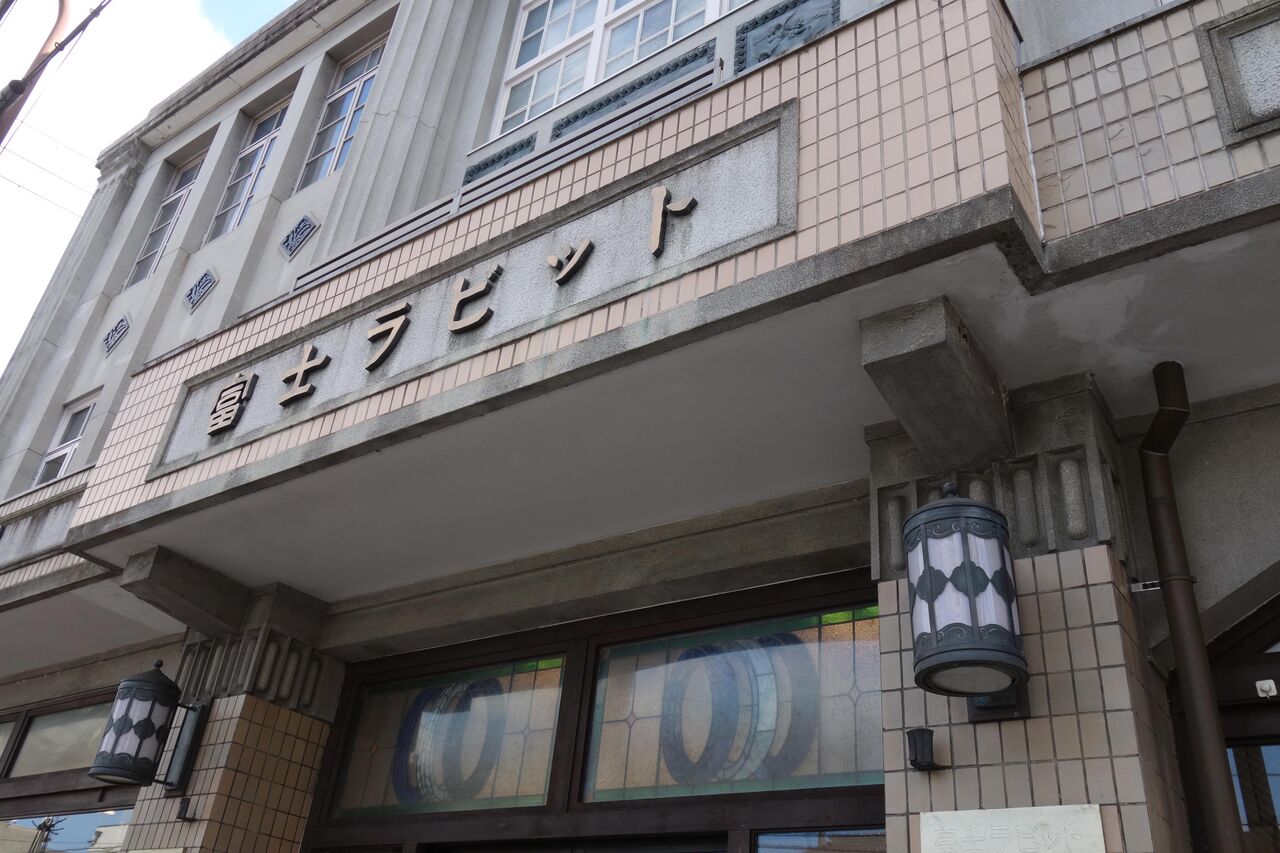 文博別館とフランソア喫茶室については、この連載前々回で触れた。進々堂へは毎秋催される知恩寺での古本まつりの折に友人らと立ち寄るが、黒田辰秋によるテーブルではなく奥の一角に通される事が多い。古本猛者は店の品位を下げるのかしら。七条通りに面した富士ラビットについては、市電の車窓から自動車整備の様子を垣間見た記憶。セセッション風のデザインと言われればなるほど、今回は見上げております。