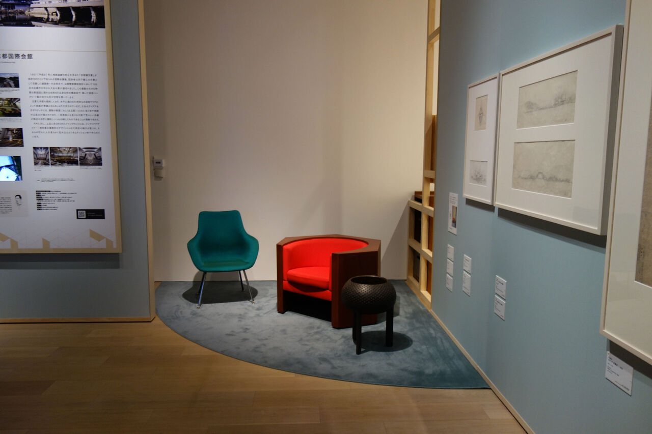 エントランスの大看板(?)は広角レンズでも収めきれない迫力で、街へ誘う仕掛けだろうか、展示部材がチープで、ちょっと違和感ありますな。展示は「古都の再生と近代」をフォーカスしたSection1から「様式の精華」「和と洋を紡ぐ」「ミッショナリー・アーキテクトの夢」「都市文化とモダン」「住まいとモダン・コミュニティ」「モダニズム建築の京都」の7テーマ、36プロジェクトに分かれ、会場にぎっしり様々な資料(図面や模型、写真や家具、映像など約400点)が壁面と展示台から溢れている。テーマ毎に色分けしているが、Section表示と資料パネルが紛らわしく、観客の動線も確保されていなくて、美術館で行われる建築展の難しさを実感した。