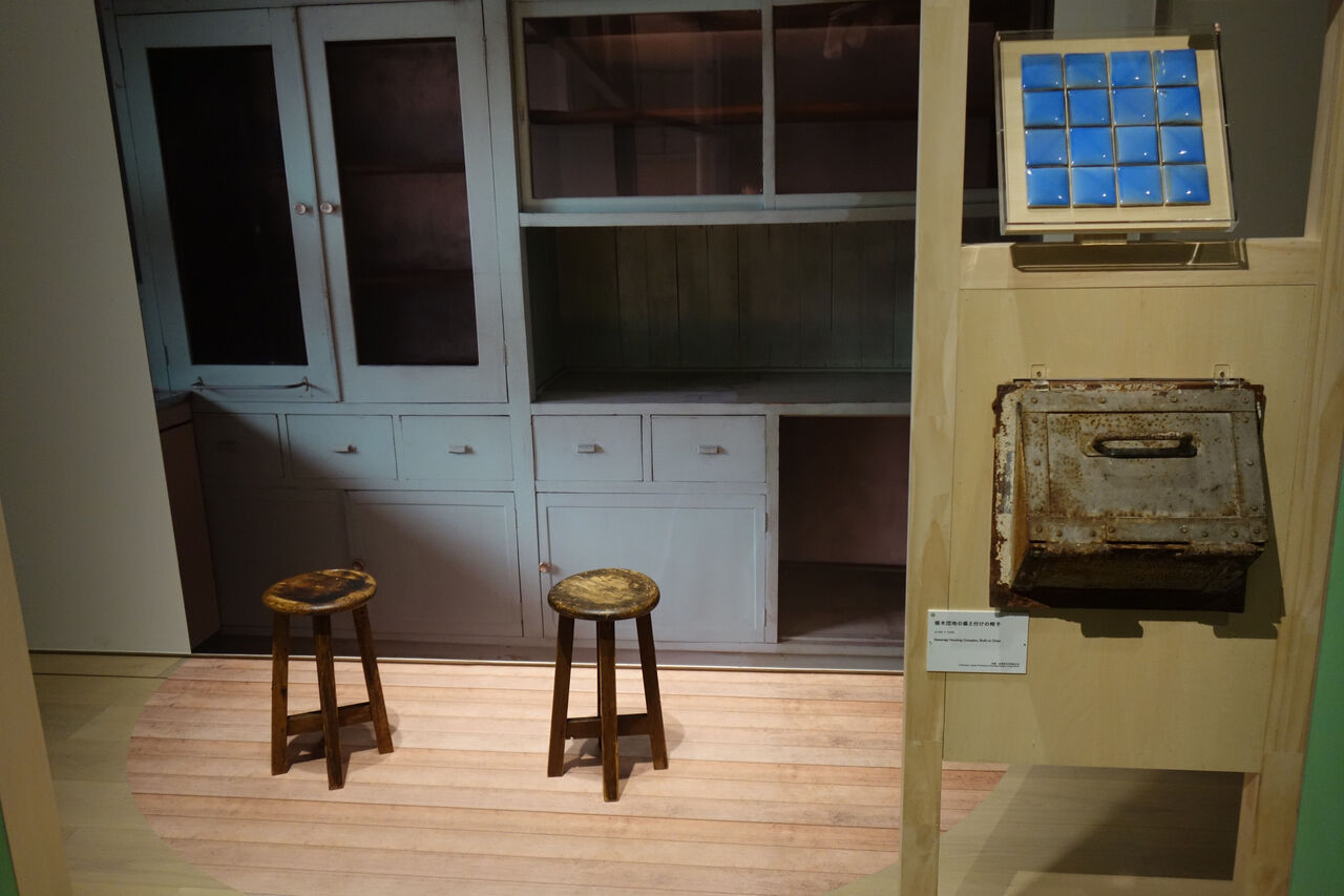 一般での見学が難しい建築などについては映像で紹介し、設計者の画帳や当初の姿を捉えた写真、置かれていた調度品や建屋内での業務に関連した「現物」なども配して、鑑賞への心配りも随所に窺えられる(前述したように、過剰であるのだが)。筆者の好みから椅子やテーブルよりも、伊東忠太が祗園閣設計の参考にした月鉾を捉えた写真、同志社普通学校生と写る新島八重の写真、そしてもちろんフランソア喫茶室の立野留志子を囲んだ写真などに関心を持った。撮り鉄ですから、同志社クラーク記念館の『建物の構造補強に用いられた鉄道レール』(1877年)の現物は別格ですな。