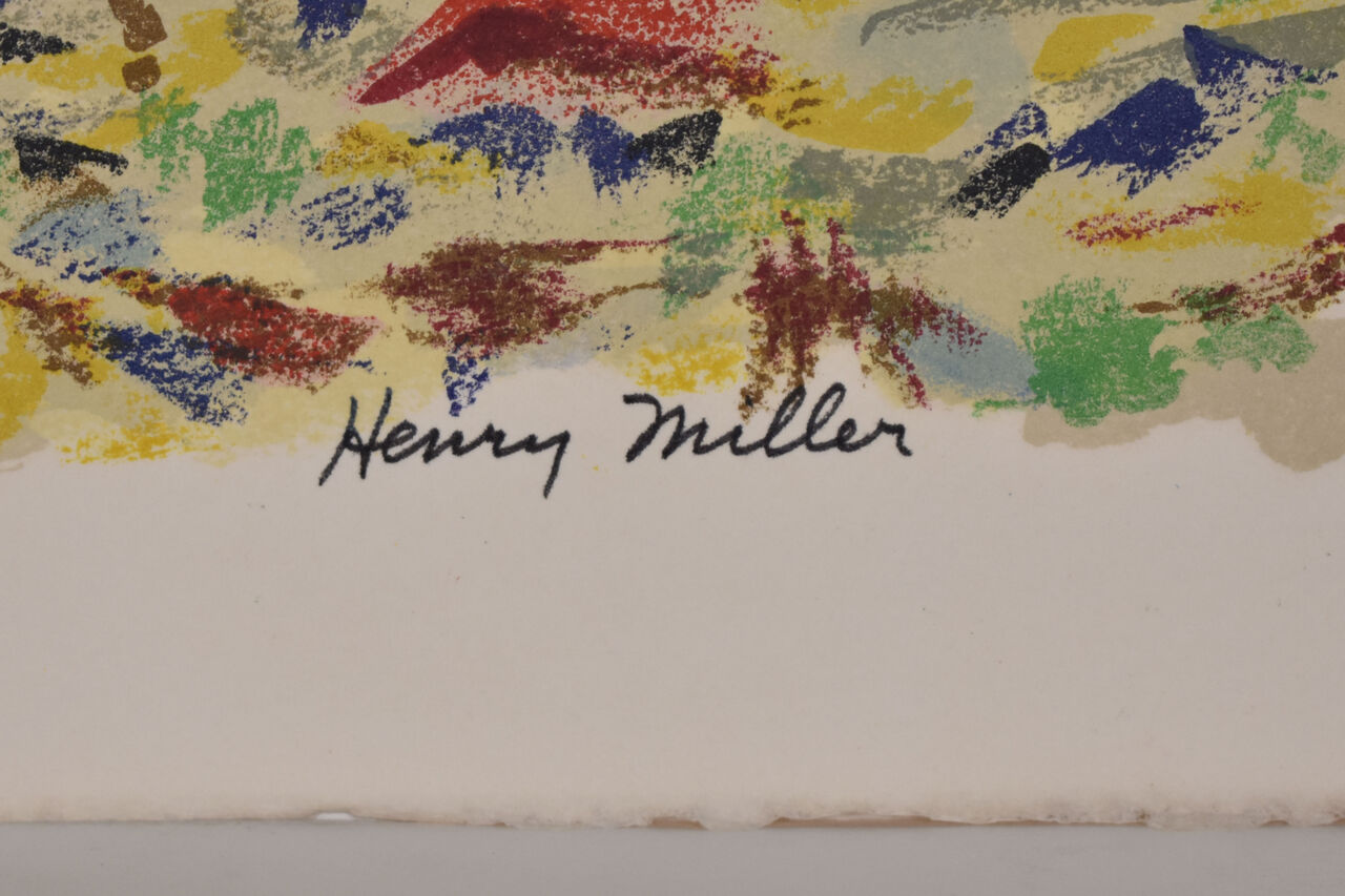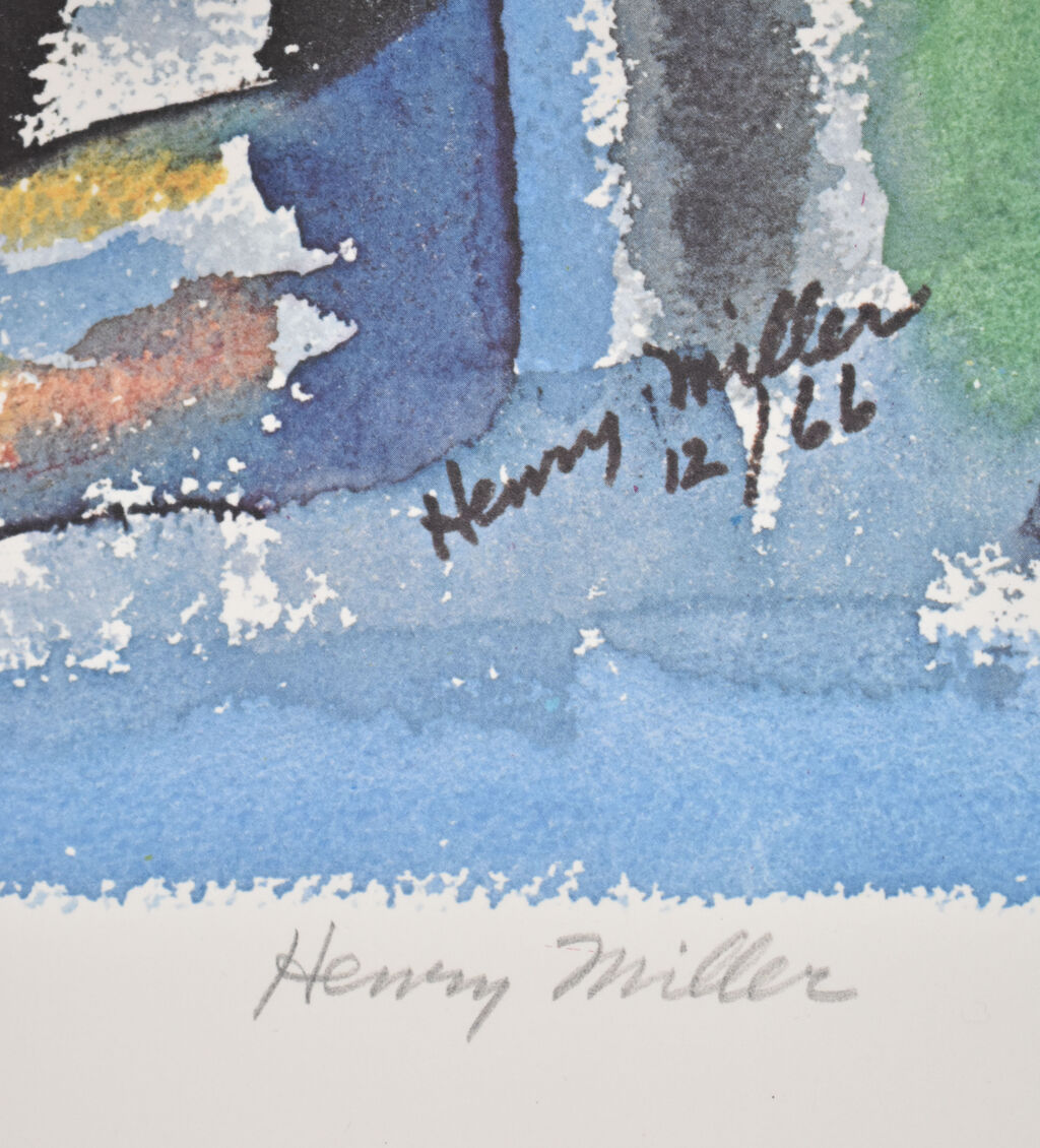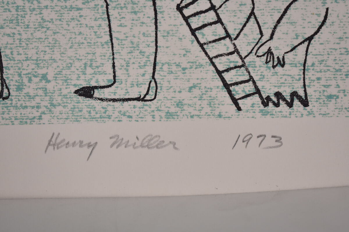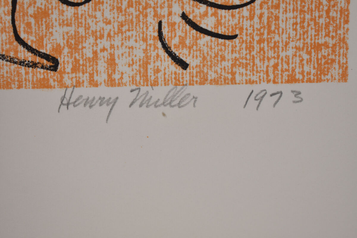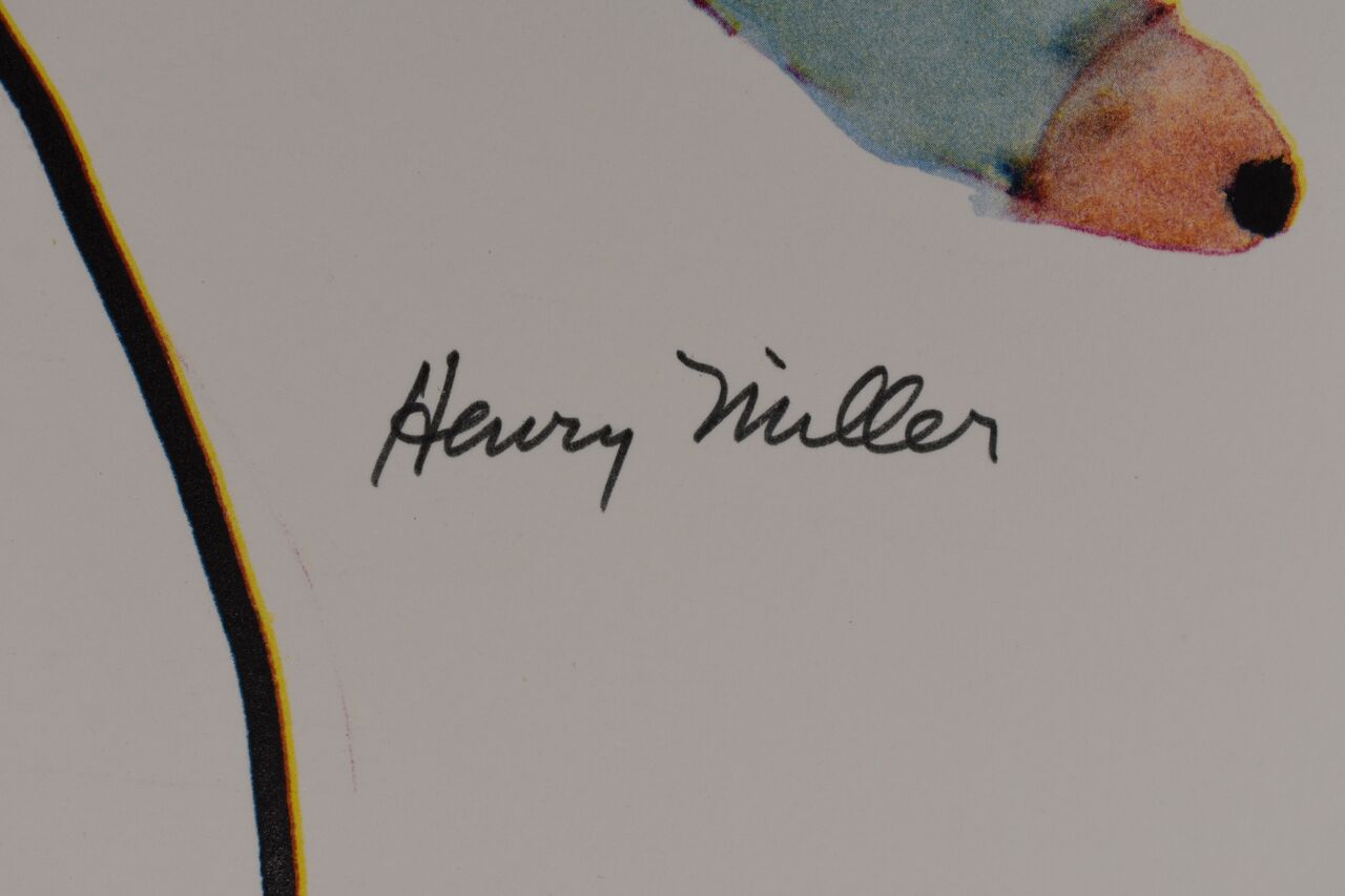 挿入された版画作品は、もともとは久保貞次郎により1968年にある画集のために制作された作品だったが、画集の出版が頓挫してしまい、作品だけが完成した。翌年、ヘンリー・ミラーが署名(サイン)したので年記が1969年となっている。このときヘンリー・ミラーの水彩をシルクスクリーンの版下に起こしたのは若き日の池田満寿夫である。いかにも自由奔放なミラーらしいのびやかな線と自由な色彩が印象的な作品である。その後、この作品は長い眠りを経て、挿入された。1970年にはファースト・インプレッションズ(サン・フランシスコ)社から日本の「S・クボ」の名で色彩石版画が2枚刊行される。以降、久保貞次郎は自ら版元となり、ミラーから買い取った水彩をもとに多くの版画エディションを世に送り出した。