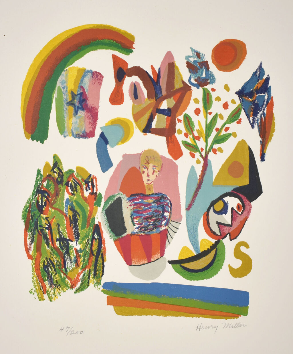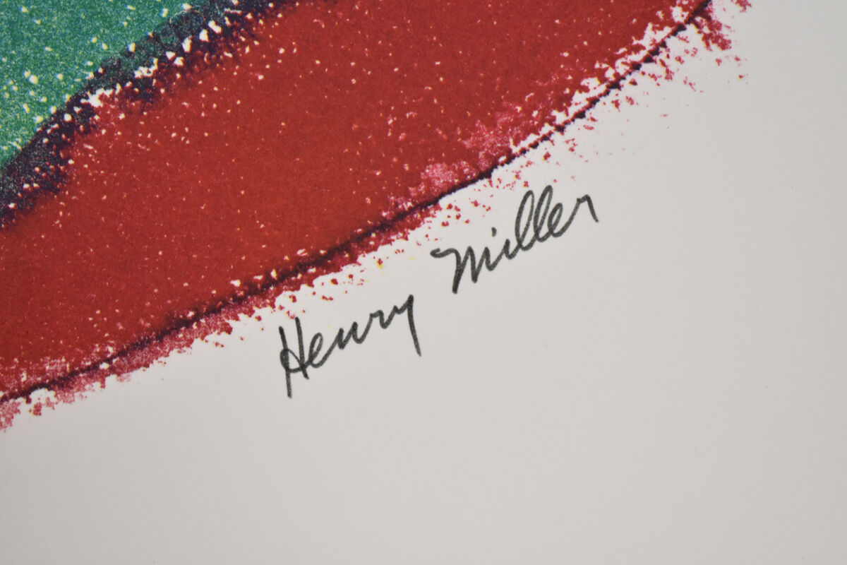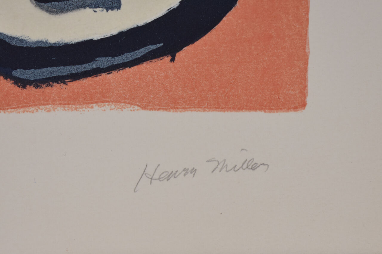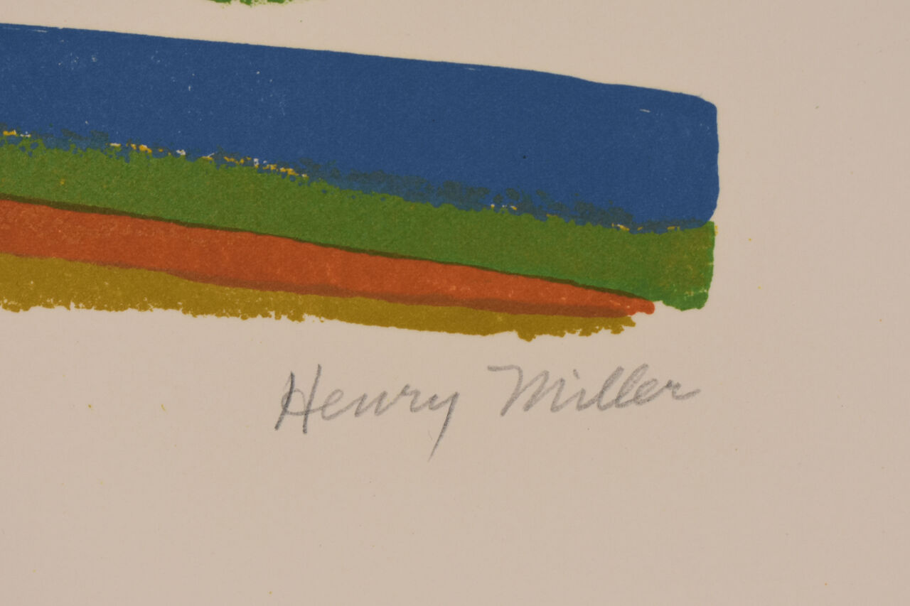 挿入された版画作品は、もともとは久保貞次郎により1968年にある画集のために制作された作品だったが、画集の出版が頓挫してしまい、作品だけが完成した。翌年、ヘンリー・ミラーが署名(サイン)したので年記が1969年となっている。このときヘンリー・ミラーの水彩をシルクスクリーンの版下に起こしたのは若き日の池田満寿夫である。いかにも自由奔放なミラーらしいのびやかな線と自由な色彩が印象的な作品である。その後、この作品は長い眠りを経て、挿入された。1970年にはファースト・インプレッションズ(サン・フランシスコ)社から日本の「S・クボ」の名で色彩石版画が2枚刊行される。以降、久保貞次郎は自ら版元となり、ミラーから買い取った水彩をもとに多くの版画エディションを世に送り出した。
