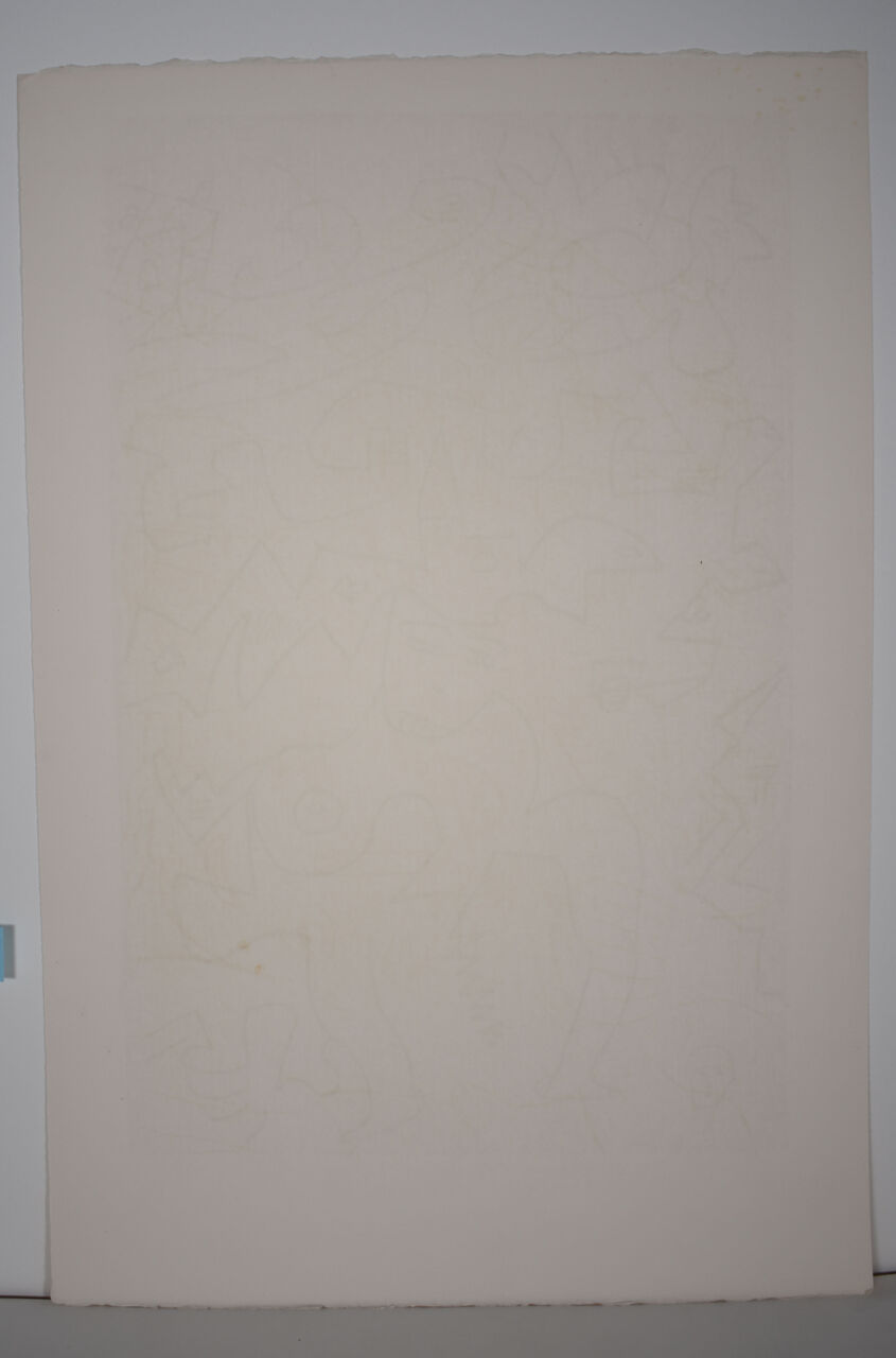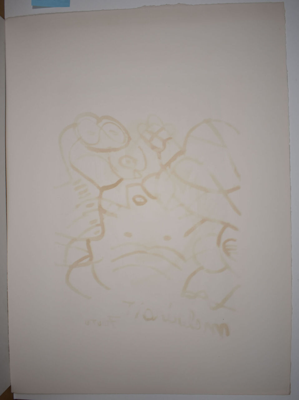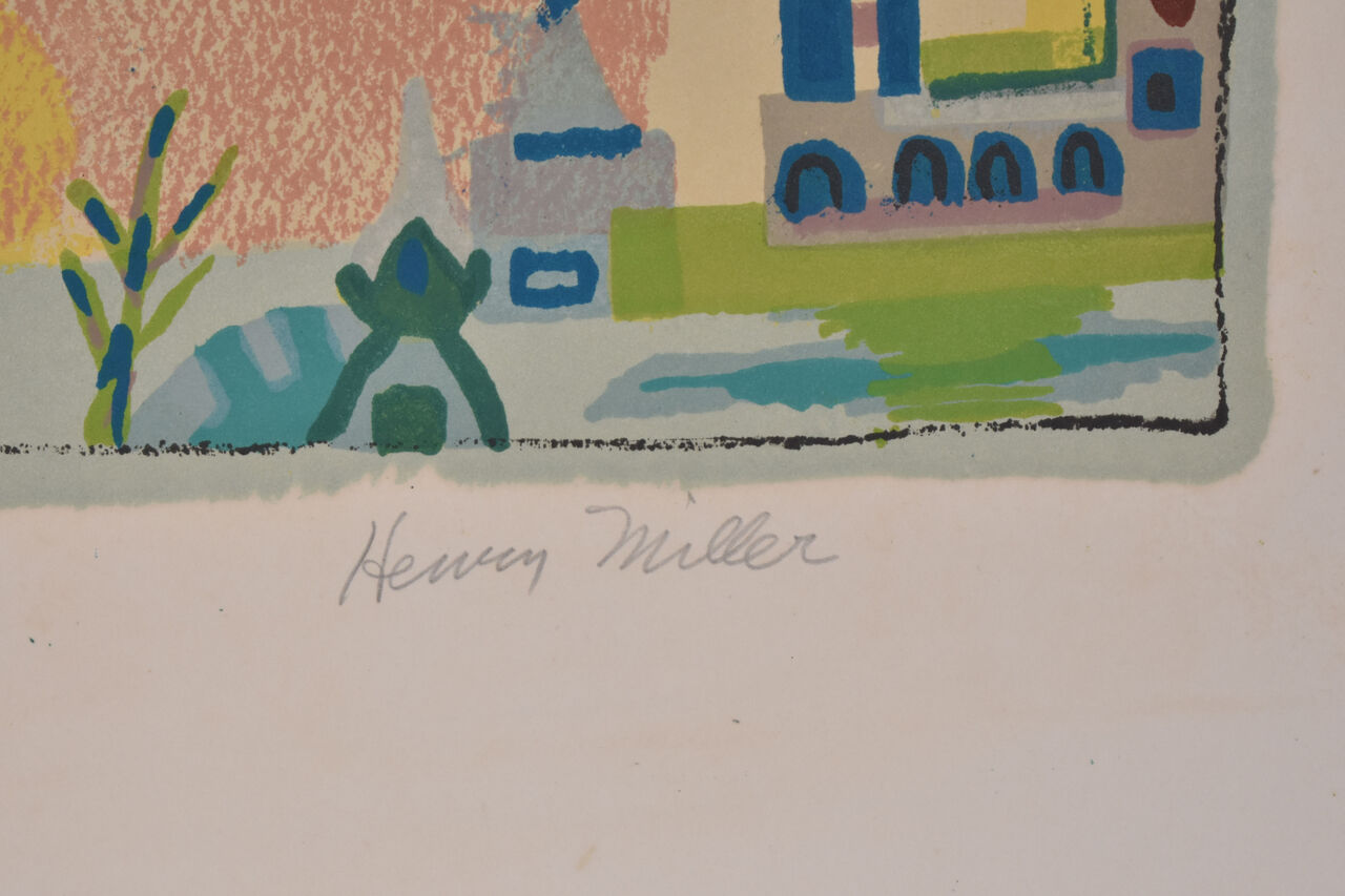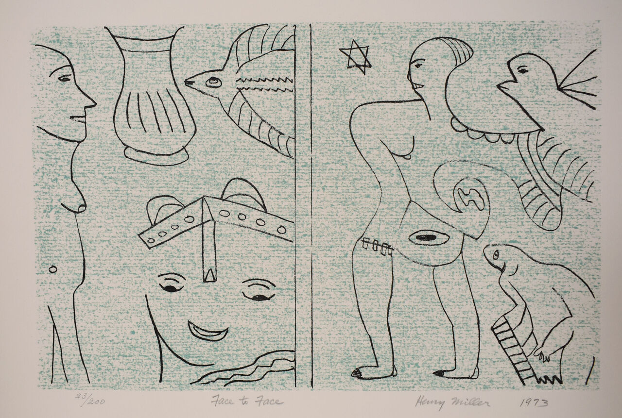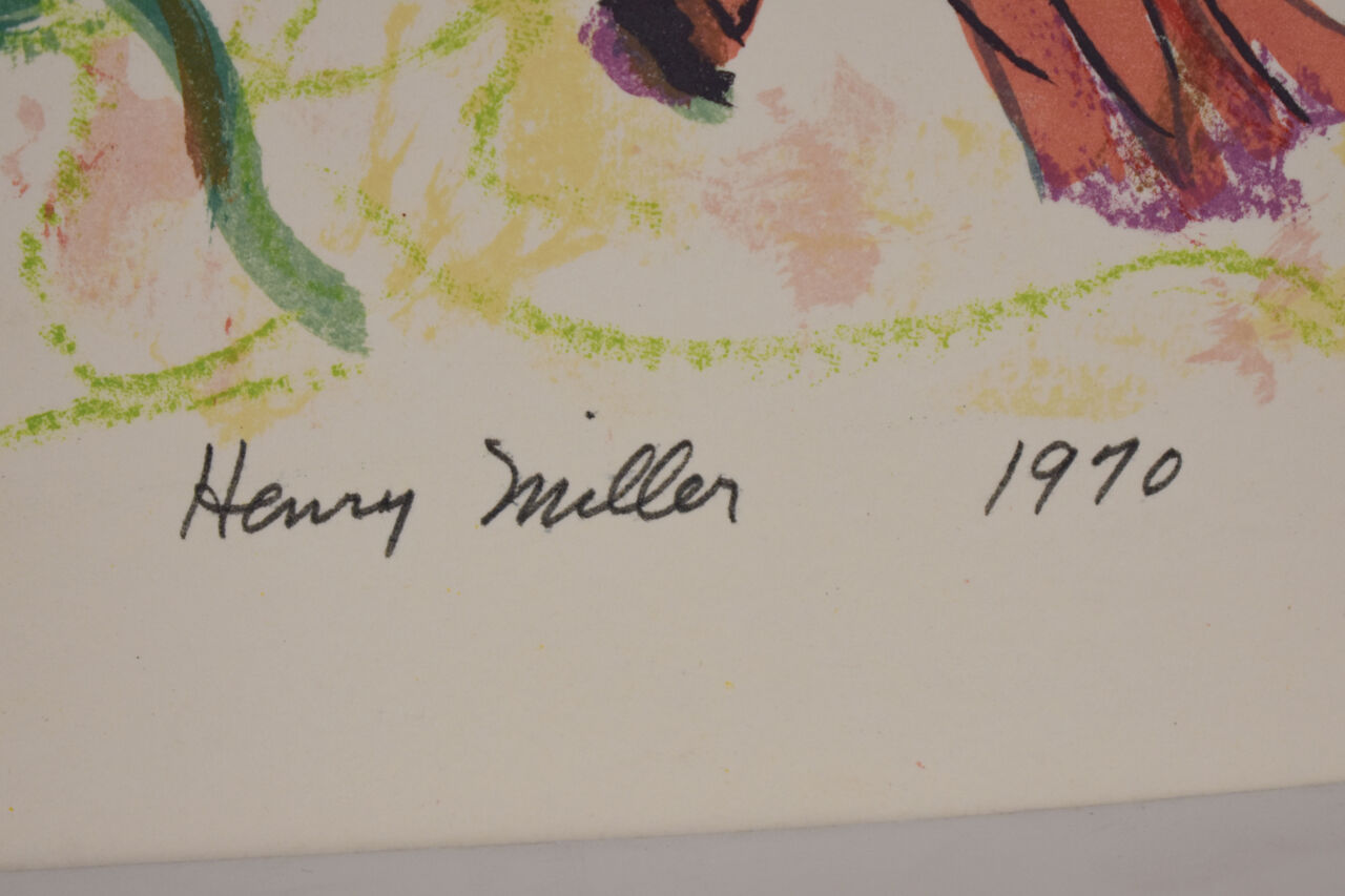 挿入された版画作品は、もともとは久保貞次郎により1968年にある画集のために制作された作品だったが、画集の出版が頓挫してしまい、作品だけが完成した。翌年、ヘンリー・ミラーが署名(サイン)したので年記が1969年となっている。このときヘンリー・ミラーの水彩をシルクスクリーンの版下に起こしたのは若き日の池田満寿夫である。いかにも自由奔放なミラーらしいのびやかな線と自由な色彩が印象的な作品である。その後、この作品は長い眠りを経て、挿入された。1970年にはファースト・インプレッションズ(サン・フランシスコ)社から日本の「S・クボ」の名で色彩石版画が2枚刊行される。以降、久保貞次郎は自ら版元となり、ミラーから買い取った水彩をもとに多くの版画エディションを世に送り出した。