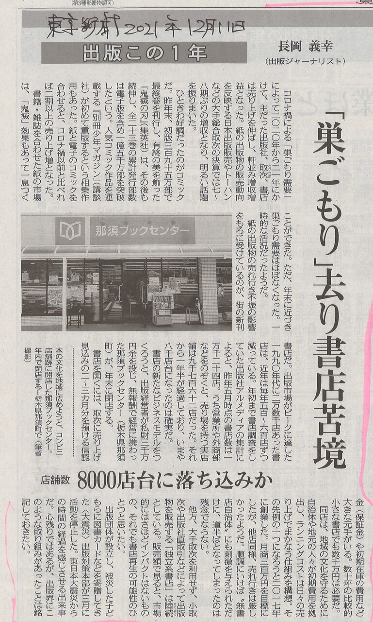 コロナ禍のせいで本の売り上げが少し増えたというニュースもありましたが、日本の町から書店がどんどんなくなっています。とても残念なニュースですが、私たちもお世話になった那須ブックセンターがついに閉店に。