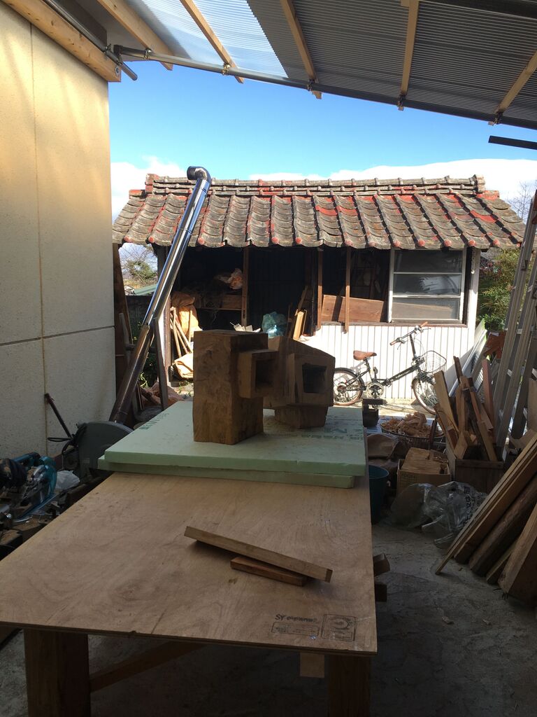 木工所の屋根壁は、近所で譲り受けたハウスパイプを主材として組んだ構造となっている。妻面の半分は木端を組み合わせた形で壁を作ったが、反対側は未だ吹きさらしの状態だ。なので冬は寒い。作業の時にはこの屋根の下で薪ストーブを焚いてなんとか凌いでいる。今後壁を作るかどうかはわからないが、壁がないことで、この場所には空洞が生まれている。制作している「群空洞と囲い」は、実は構想のきっかけとして、そもそもこの作業場所があったのかもしれない。さらに元を辿れば、私の師である石山修武さんの建築が常に保持していた空洞性への憧憬があるのかもしれないが、ともかく、空洞の探究をこれからも続けていきたい。