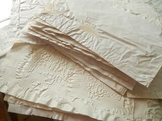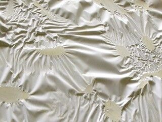 その作業には手を貸すが、自然の作用に委ねた作法である。しかし、紙の質や、粘土の柔らかさ、水分の強弱、そして紙を敷く板など、実験を重ねると面白い結果が得られた。敷板の木目が柾目か節目かの違いや、陶土板の形、大きさ、厚み、また紙の上に載せるときの強弱などによっても襞の形状は変化する。同じ襞は生じない。また、下敷きにガラス板など凹凸が少ないものを使うと襞は生じなくなり、新聞紙ごと活字も収縮する。木目がある場合は微細な板と紙の隙間から空気が入り込むのだろう。土の水分を吸収し、土と紙が濡れて一体化し、徐々に渇き収束した結果が「襞」を生む。
