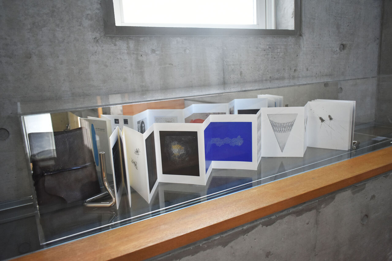 左のアクリルケースの中は、宮脇愛子『Hommage a Man Ray マン・レイへのオマージュ』、壁に展示しているのは関根伸夫《三角の波のproject》