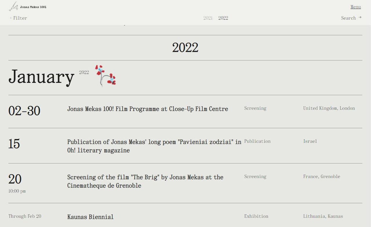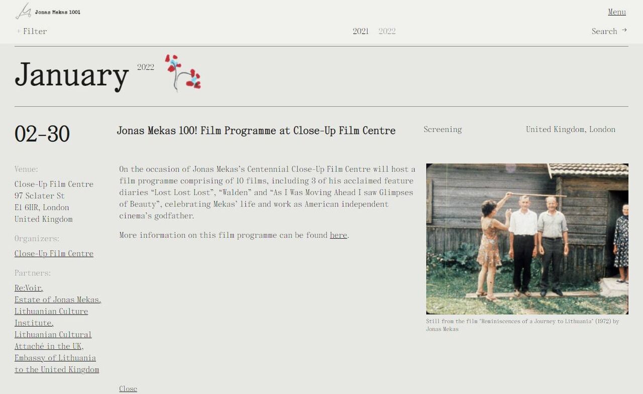 20~21世紀を代表する映像作家の生誕100周年という節目に、世界規模で様々な企画が進行しておりますが、個人がそれらの企画を全て把握するのはインターネットで情報を手軽に入手できる昨今でも簡単なことではありません。そこでジョナス・メカス財団とLithuanian Culture Institute(リトアニア文化研究所)が主体となって開設されたのがこのサイトです。運営の趣旨はメカスの作品をより大きく世界に認知させ、彼の映画、映画批評、文化組織、そして特に彼の詩と散文を通じたそれぞれの分野への貢献をより深く探求することとサイトの紹介文には書かれています。