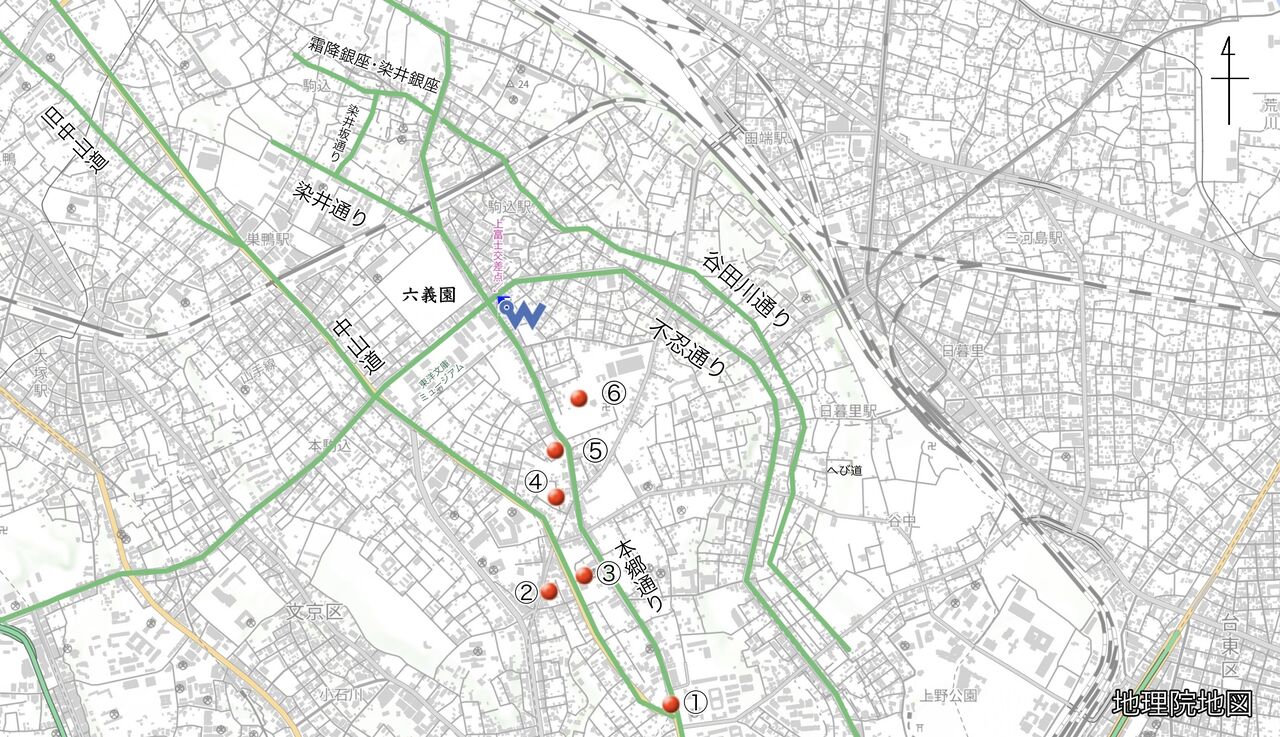 (地下鉄南北線東大前駅)→ ①本郷追分 → ②円乗寺 → ③大円寺 → ④天栄寺(駒込土物店跡) → ⑤南国寺(目赤不動) → ⑥吉祥寺 → 次回に続く