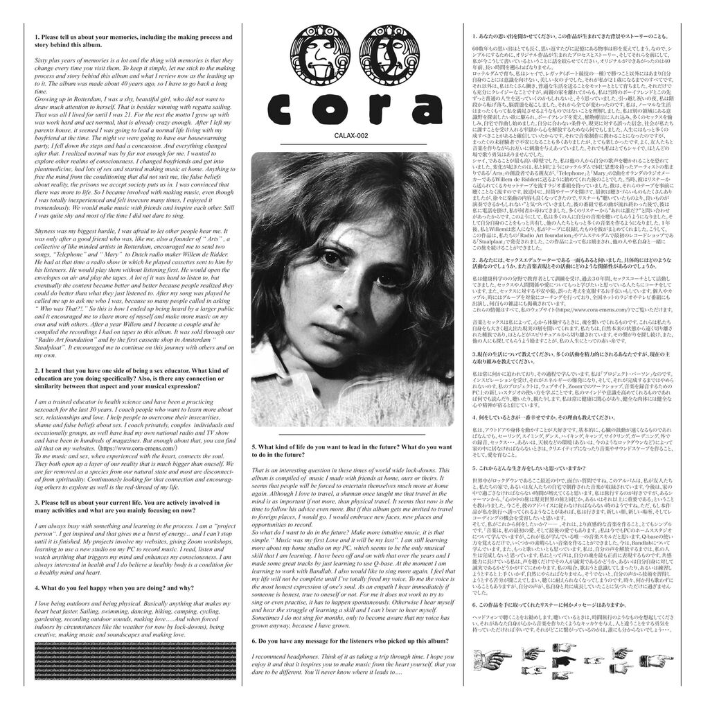 オリジナルはアムステルダムにあるアラード・ピアソン博物館に所蔵されており、もうほとんど市場では流通しておりません。わたしたちカラックスレコードは、この作品と奇しくもインターネットで出逢うことができました。そして彼女とも、オンライン上ではありますが、メールとビデオにて2回インタビューを実施し、メールでのインタビュー内容は製品内部のリーフレットに、ビデオインタビューの内容は、わたしたちのサイトにて全文を掲載しています。ご興味ある方は是非、お読みいただけると嬉しいです。