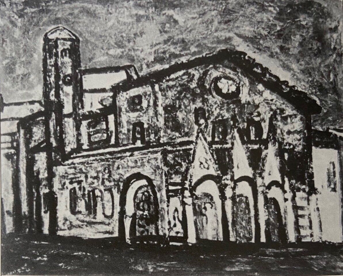 つまり、1934年、二科会初入選の前年にどのような作品を描いていたのかという確かなものがないということになる。またルオー風の画風の作品で確かな年記のものは、1935年の9月の初入選した二科展より以前の1月に開催された第5回NOVA展に出品された『建物』(図4)があるだけである。あとはこの頃描かれたものであろうという作風からの推定であり、多くは朝日晃や関係者が実作などを見ながら比定したものと思われる。ところが、松本には戦後の一時期に骨太の線を用いた作品を描いていた時期があったり、後から「竣」と彫られた印章の押印された作品があったりするなど、ルオー風の作品の制作時期に関しては個々に精査が必要なのではないかと思われ、これまでの展覧会カタログや画集などのこの時期の分類を少し疑っている。