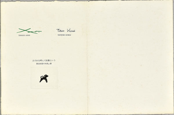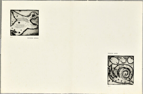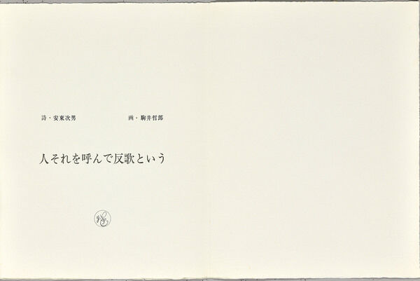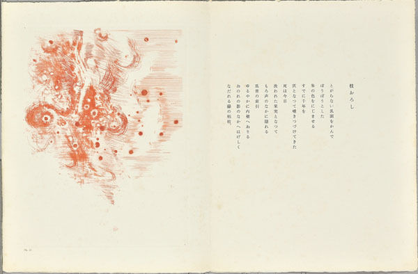 *駒井哲郎は多くの文学者と詩画集などを作りましたが、安東とのこの詩画集は生涯の代表作でしょう。どのような色で刷るかについても安東の強い希望が反映されており、一方で駒井の作品を見て安東も詩を書き直すなど文字通りのコラボレーションの精華でした。全16点、たとう、ケースとも完全セットは稀少です。