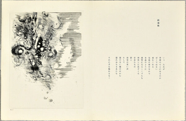 今回の「Part2 駒井哲郎と瀧口修造」では詩人・安東次男との詩画集『人それを呼んで反歌という』全点を展示するほか、その才能にいち早く注目した詩人・評論家の瀧口修造など駒井が影響を受けた作家たちの作品も合わせてご覧いただきます。画廊では窓を開けはなし換気につとめ、検温、マスク、消毒、手洗いなど安全万全に万全を期しています。