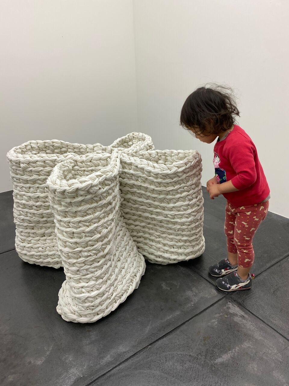 重なる、からまる、折る、立つ、といった単純な現象から成る、構造と重力を面白がる形をこれまで作ってきた。大きさは大小に変化し、その大きさに伴って変化する空間を楽しんできたように思う。折ったら立つ、積もったら大きくなる。長細いものは編める。編んだものは解ける。生活の中にあるやり方で仕組みが生まれ、構造物が出来上がる。