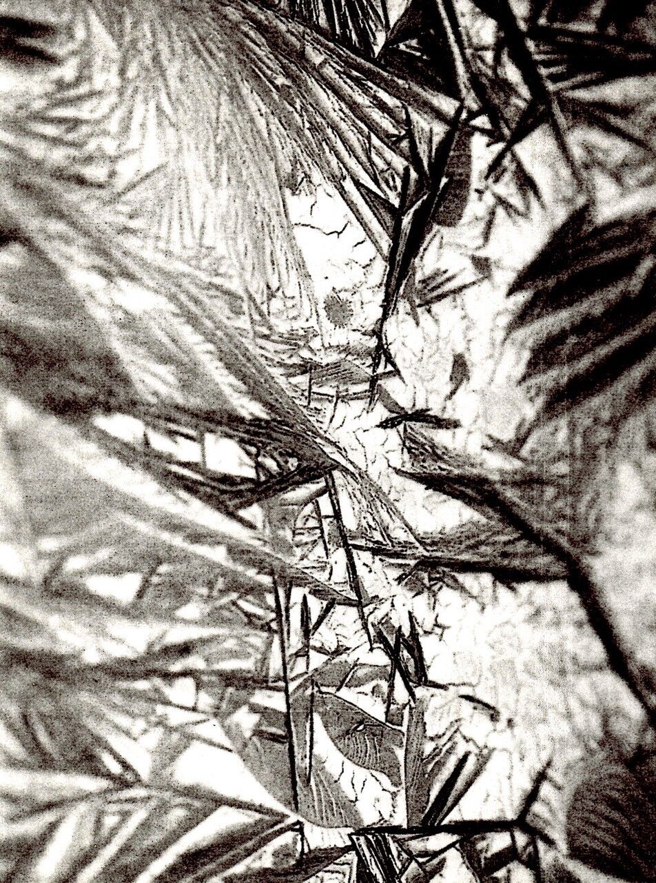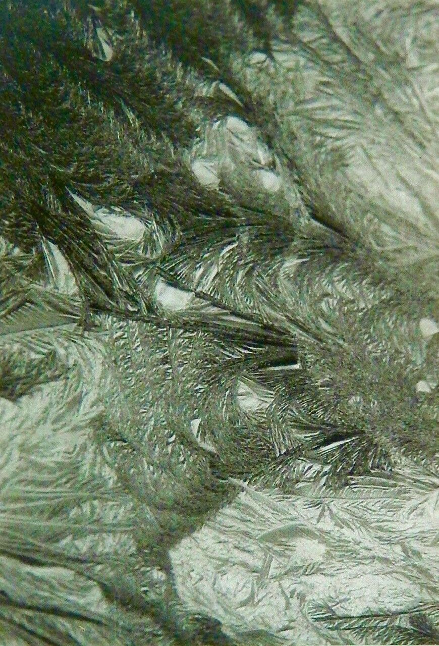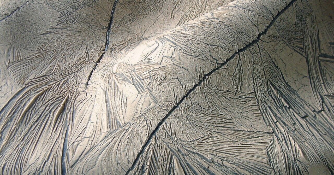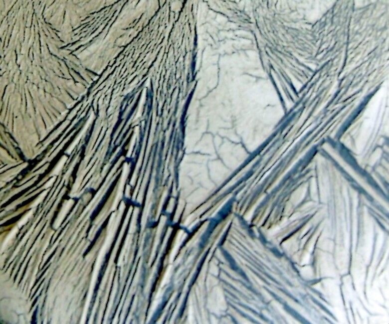 それ以前から「焼凍土」の実験や試作を続けていた。あるとき泥漿を凍らせたらと思い、妻に相談し冷蔵庫の冷凍室でテストしてみた。翌朝見事に凍結晶文様が表れている。それで業務用の冷凍庫を買い入れた。それにしても自然の営みの不思議さに驚かされる。異なる陶磁土や、水分の強弱、冷凍庫内の温度差など人為的な作業には手を貸すが、同じ条件下でも結晶紋様は違いを見せる。同じ相をしているが、ひとつ一つに差異がある。人や生物などと同じで、有機的な証ともいえる。作品写真の部分でも見られるが、強い結晶紋様が大きく延びるその下をかい潜る様にして少し弱い結晶文様が現れる。あるいは、先にできた弱い結晶紋様を覆いかぶさるような見方も出来よう。そしてまたあちこちから別の紋様が現れる。政治、経済、社会的仕組みを意味する見方もできる。また、凍結作用が生命奪う無機的でありながら、その結晶紋様が何か有機的でもある。なにか植物か鳥の羽など生命を持つもののようにも見える。かつて宇宙の木星の第3衛星ガニメデの写真が公開された折に、同じような働きの形跡を見て驚いたことがある。神秘的と言える泥漿の凍結晶、いま惑星ソラリスに想いを馳せている。