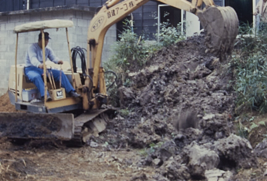 アトリエに隣接した屋外に「土捨て場」と言っている、約、立、横、深さ約1メートル50センチの畑地を掘った穴場がある。1972年から始めた陶造形の仕事で、制作上余った陶磁土や、屑土、永く使わなかった乾燥したものを「捨てる」のではなく「溜める」場でもある。普通陶芸では、ろくろ仕事などで余った土をまだ柔らかなうちに練り直して再利用するのだが、陶造形のインスタレーションでは大量の土を使うから、どうしても土の切れ端が多く出る。その普段何気なく使っている陶磁土だが、硬くなった残土を柔らかくするのは実は大変なことなのだ。原土や原石を砕き、不純物を取り除き水に溶かす「すいひ」作業がある。そして沈殿した泥漿(泥土)から適当な水分を取り除き、土練機にかけて精製粘土にする。そのような精製過程はそれなりの設備がいるから、個人の力では、制作で余って硬くなった陶磁土を元に戻すには無理があるのだ。いまは陶産地の組合や、陶芸材料を扱う会社から、日本全国、一部世界の陶芸地から電話で好みの陶磁土を取り寄せられるが、それでも真空土練機で土中の空気を抜く作業が必要になる。あるいは手揉みで。