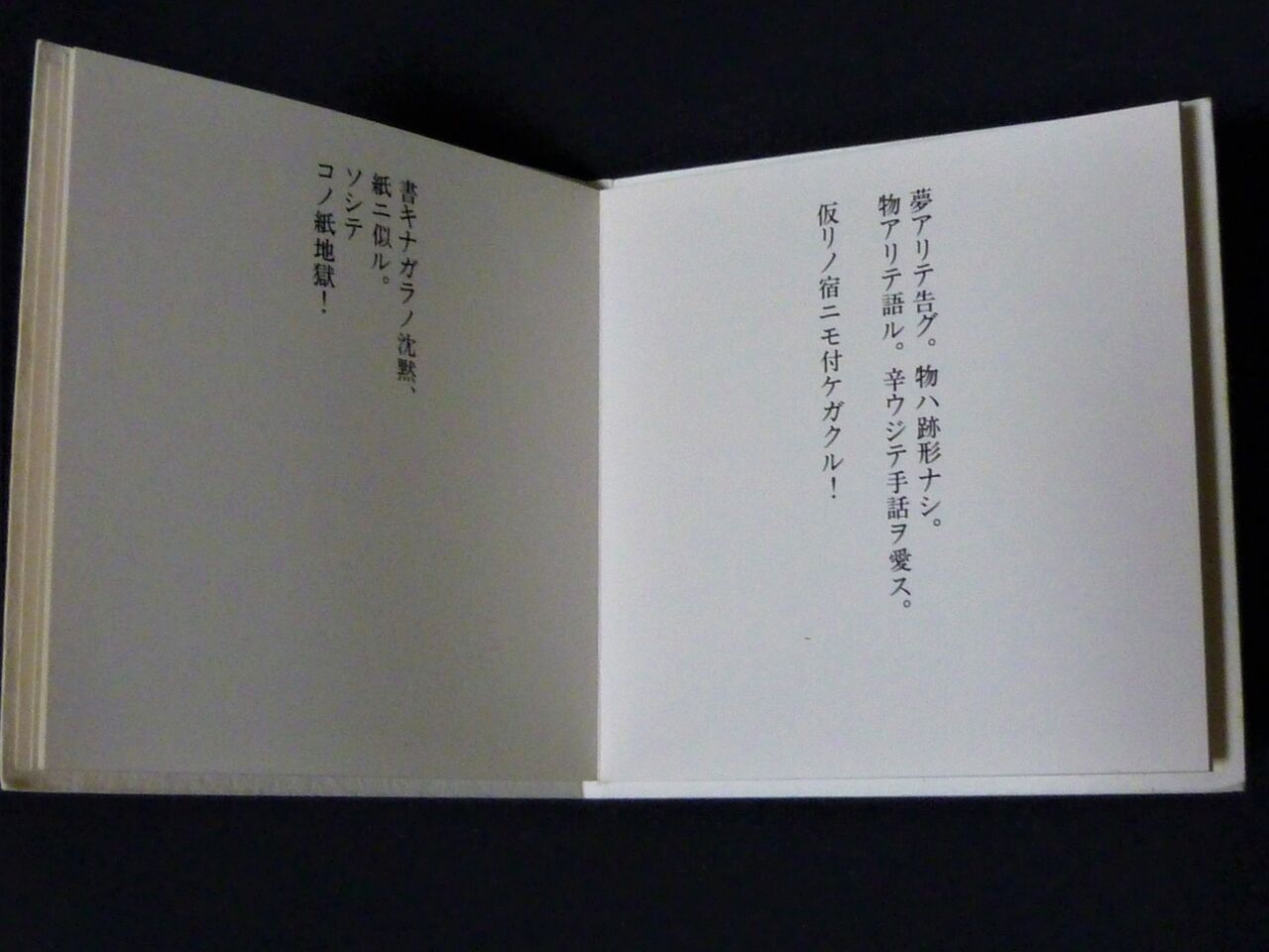 「掌中破片」は豆本のようなサイズで加納のエンコスティックとメタルプリント併用の作品に瀧口の詩が載っている。晩年の詩的実験とも言うべき「自在諺」の短詩である。奥付には1979年1月元旦発行限定279部定価2千5百円とあるが、加納によると実際に刊行されたのは3月とのこと。