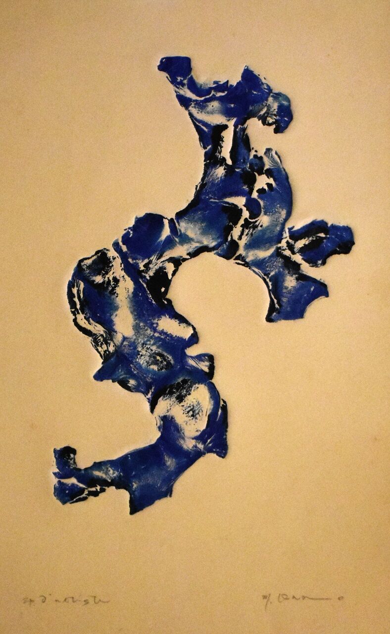 メタルプリントという技法と題名の由来については「加納光於の色彩探究の第一歩は「ソルダード・ブルー」というメタルプリントのシリーズから始まる。これは亜鉛板をガスバーナーで処理しそれを基本的には凸版で刷ったものである。亜鉛板そのものは「Mirror,33」というメタルワークのシリーズとして作品化されている。(中略)そしてソルダード・ブルーというタイトルは石鯛の接合歯に由来するという。凸版刷りによって紙に喰い込んだ青を実見すればこれはなるほどソルダード・ブルーである。そればかりではない加納にとって青は天空的なものと地上的なものを「接合」する理念的な色彩でもあるのだ。」(「加納光於PAINTINGS’80-83展」北九州市立美術館1983年9月刊より)と黒岩恭介学芸員が解説している。このシリーズは1964年から65年にかけて制作され、「刷られた紙の裏の凹凸の激しさは、版画用紙を突き抜け、プレス上のフェルトまで切り裂くほどでした。」と作家自身が語っているだけにその刷り部数は少ない。