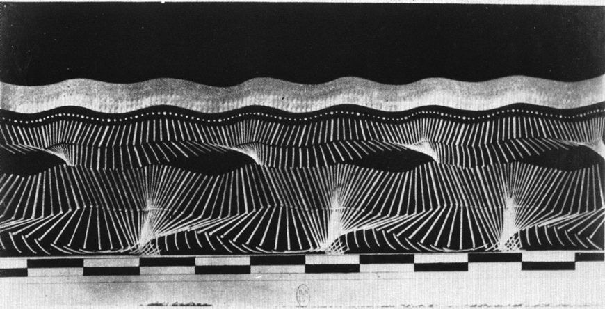 その時の驚きは今でも忘れられない。写真で複製された素描の上に、黒色の水彩絵の具で画家の手が加えられている。細かく位置の定められた点と点とを几帳面に線で結ぶことで生み出される幾何学的構成の緻密さとは対照的に、絵の具の濃淡が生み出す表現は即興のようなタッチを残しており、この一風変わった下絵の実験的な性質をあらわにしている。