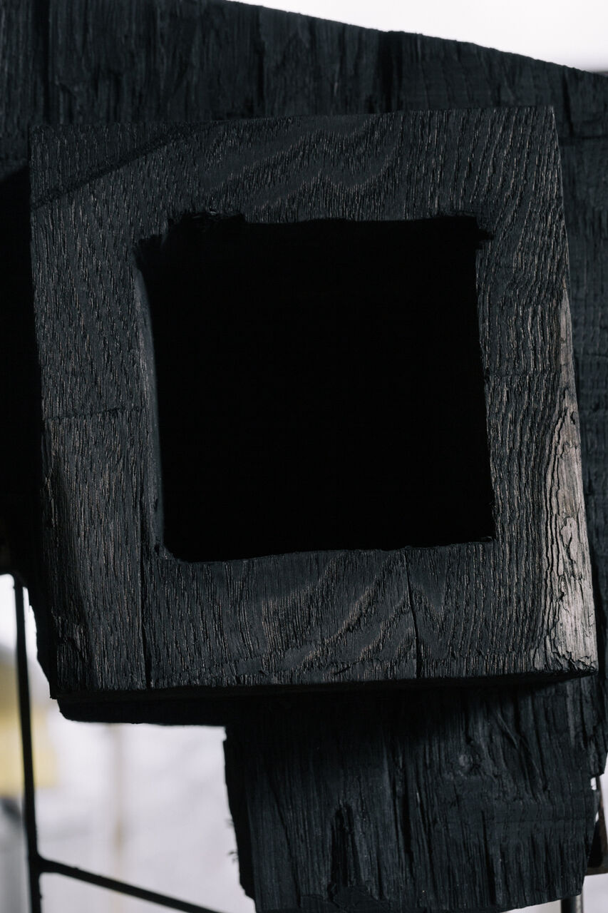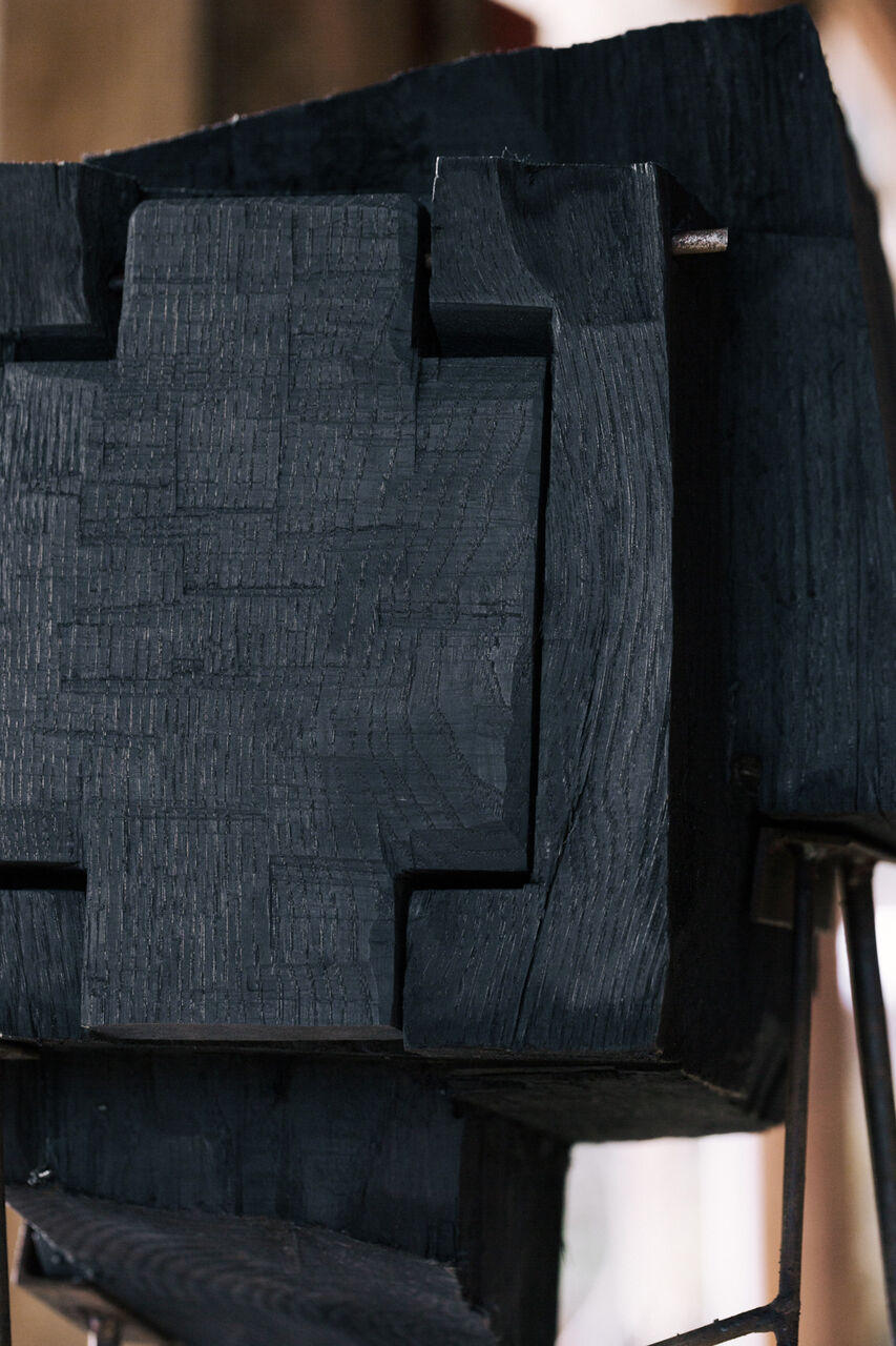 そして鉄とクリを組み合わせを試す中で大きな問題が発生した。クリ材に鉄が触れると、その触れた部分が黒ずんでしまうのである。その反応が一体何なのか分からなかったが、調べてみるとクリのタンニンと鉄の反応であることが分かった。であればと、クリ全体を鉄で染めてしまうことを考えた。そうすれば、鉄とクリの取り合いに余計な配慮がいらなくなる。正確には染めというよりも、変色に近い反応と思われるが、そんな制作の飛躍は、大玉村で藍染めの活動を仲間とやっていたことから来ているのは間違いない。そうして、空洞はクリの塊で囲われ、さらにその外側に分子レベルでも鉄の皮膜を纏うものとなったのである。