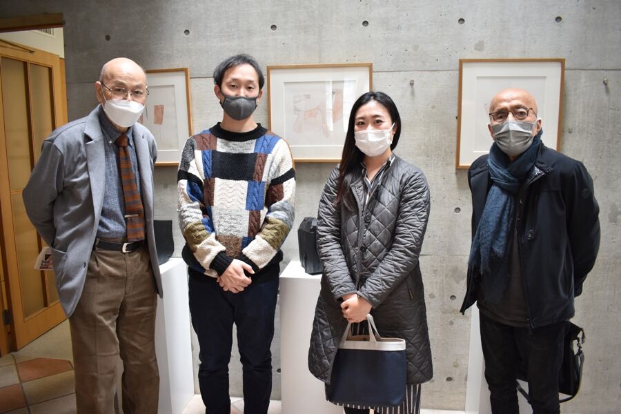 20220402阿部勤先生右から阿部勤先生、Azuさん、佐藤研吾さん、画廊亭主