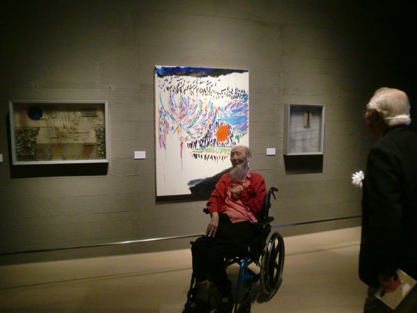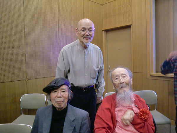 内覧会にて。左から池田龍雄先生、亭主、山口勝弘先生