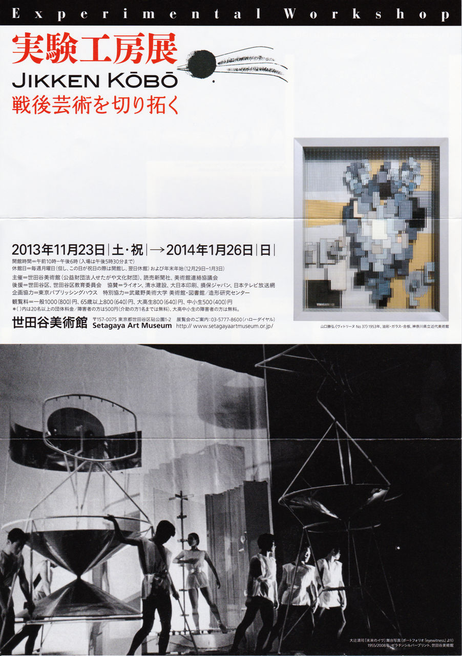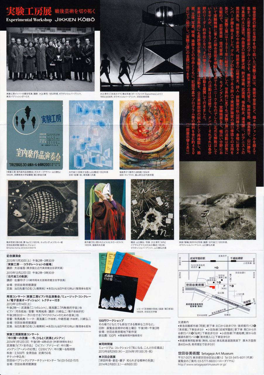 1951年に結成され、美術・音楽・舞台の総合を標榜するなど世界的先駆者でもありました。グループの命名者である美術評論家で詩人の瀧口修造らの支持を受け、「実験工房」の活動は1951年のピカソ展を記念したピカソ祭のバレエ『生きる悦び』の開催からスタートします。その後「実験工房」はダンス、演劇、映画といった多岐にわたるジャンルへと活動の幅を拡大して行きました。正式な解散はしていませんが、グループとしての活動がほぼ終了する1957年頃までの間、総合芸術としての斬新な舞台公演や現代音楽のコンサート、そして現代美術の世界でパイオニア的な作品を多数残しています。