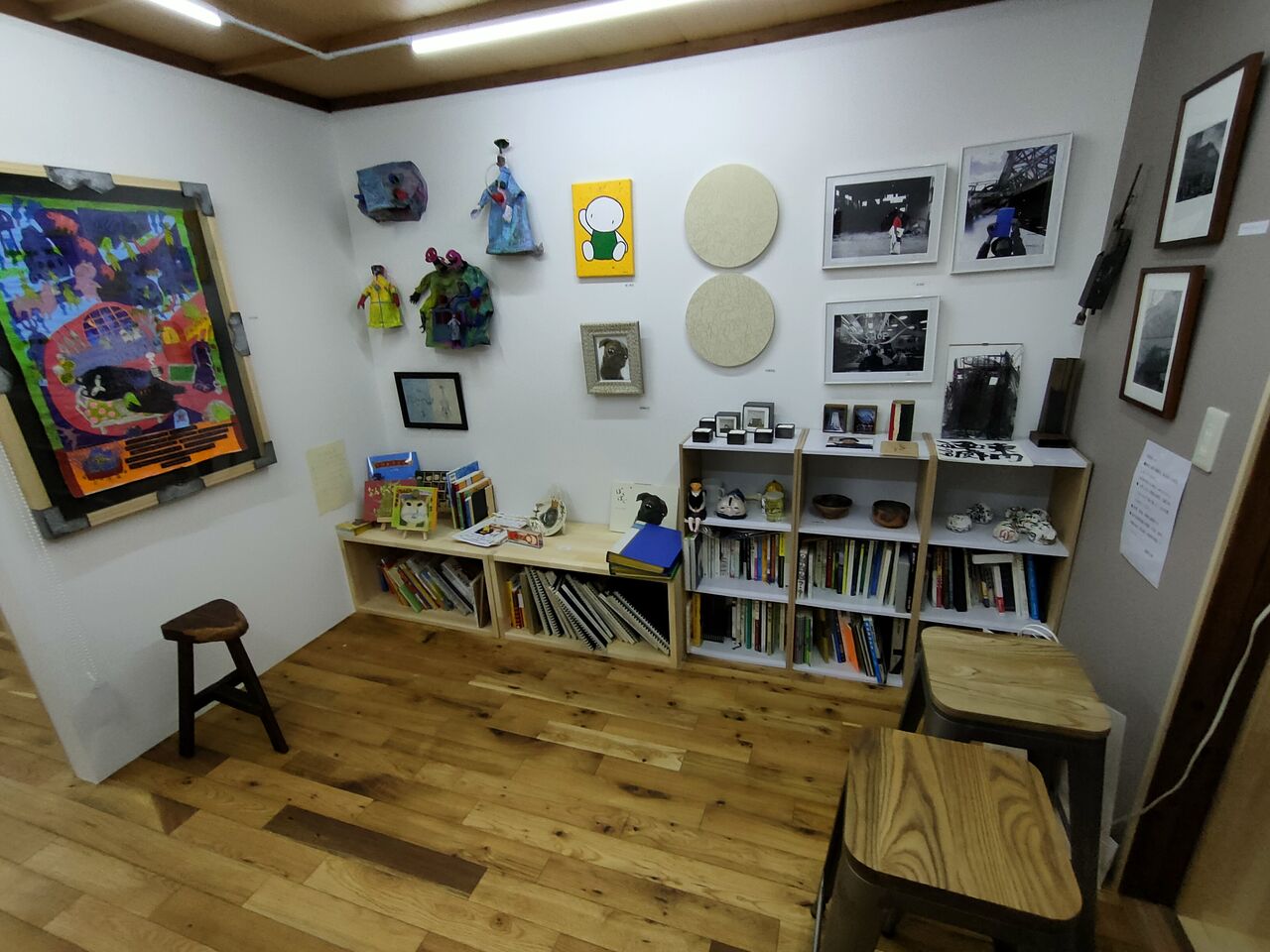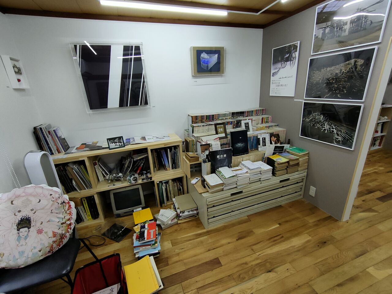 2022年2月、ギャラリーの両隣に「藝術文庫」と「W/M事務所」を開設し活動の場を広げました。「藝術文庫」は美術関連書籍の収集閲覧のためのスペースとなり、その他、個人映像作家の作品上映、ワークショップなどを行う予定です。こちらには榎忠氏からの寄贈本、『美術手帖』約600冊(榎忠氏についての記事掲載分)などが既に揃っています。「W/M事務所」はギャラリーの事務所兼コレクション作品常設展示場として使用します。