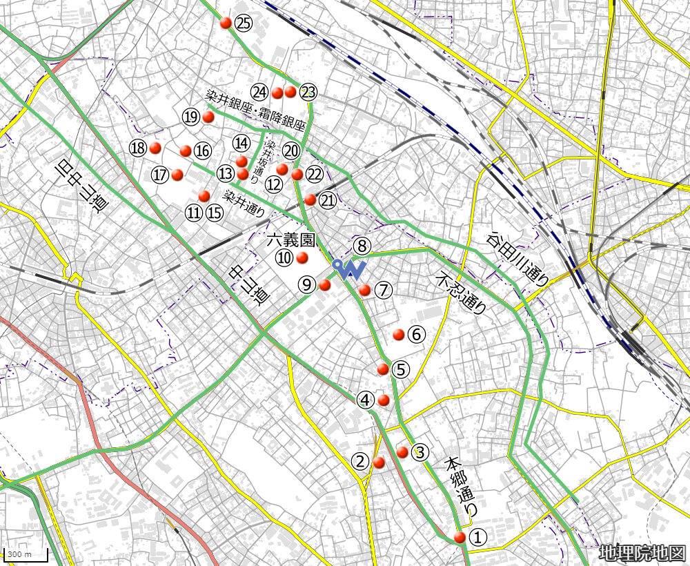 ㉑JR駒込駅 → ㉒駒込妙義坂子育地蔵 → ㉓古河庭園 → ㉔無量寺 → ㉕西ヶ原一里塚