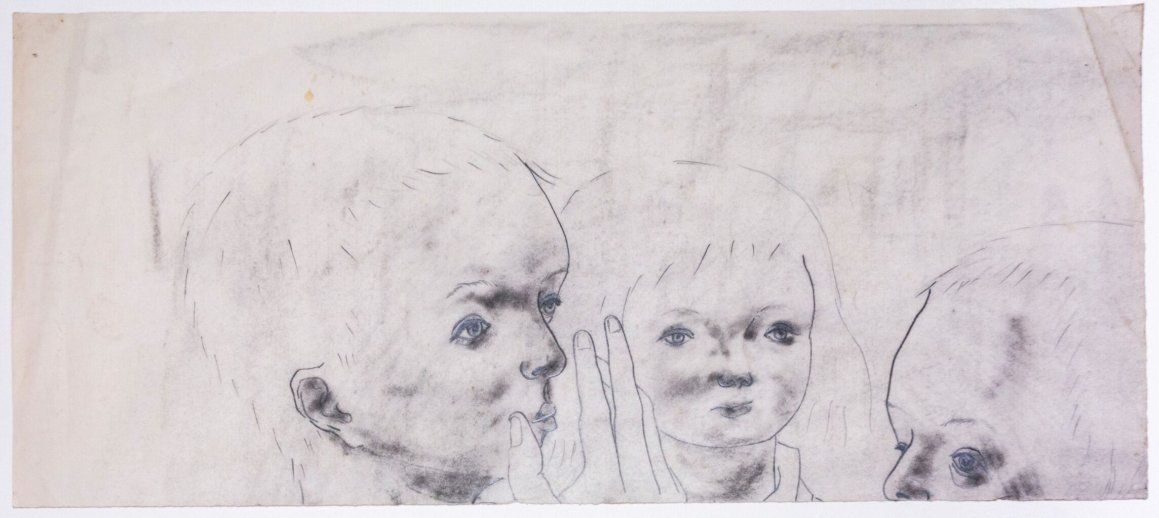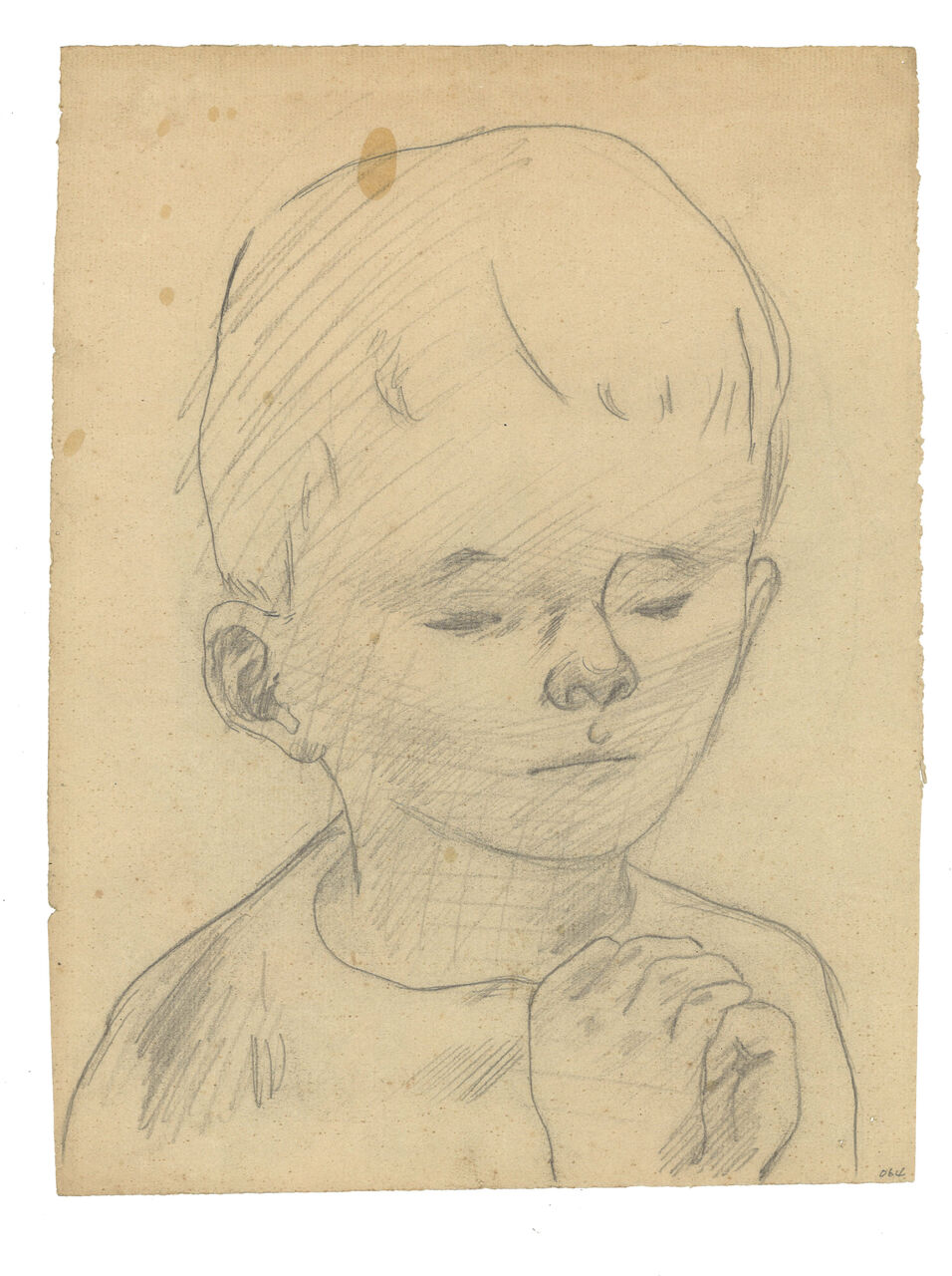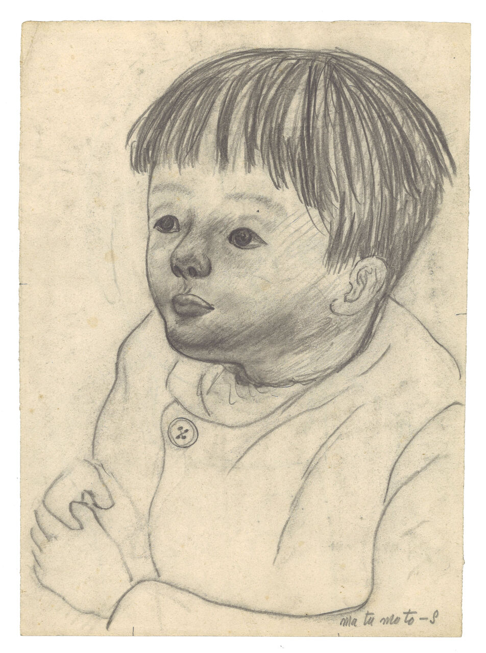 とはいえこの子どもは、正直言って、手放しに「かわいい」とは言い難い。本展に出品される、少し後の素描《コップを持つ子ども》(1942年12月制作、cat.no.2)では、はにかむような表情に誰しも「かわいらしさ」を認めることであろうが、油彩(cat.no.1)の子どもは、顎をひき、下唇をやや出して、ちょっと不機嫌そうにも見えるし、コップを持つ手にもぎこちなさが感じられる。それがかえって、ステレオタイプな子ども像に回収されないリアリティを感じさせるかもしれない。純真無垢な天使のような存在ではなく、何を考えているのかうかがい知れない謎めいた存在としての子ども。実際のところ、子どもがそうした瞬間を垣間見せることがあるのはまぎれもない事実であろう。この絵に、画家のわが子への限りない愛情が込められているのはまちがいないけれども、その表現に甘さは微塵もなく、ただひたすらに、わが子の「存在」を手探るように、この絵はできているように思われる。そしてこの眼、少し不機嫌そうな、謎めいたまなざし。どこかでこれと似たまなざしに出会っていると思いを巡らしてハタと思い至ったのは、奈良美智の(とりわけ1990年代の)一連の作品だった。画面のこちら側の私たち、あるいはそのはるか先を睨みつけるような奈良の絵の子どもたちが、ステレオタイプな子ども像を破壊しながらも私たちを惹きつけてやまないように、この《コップを持つ子ども》もまた、子ども像の傑作のひとつとして多くの人々の心を捉えることだろう。